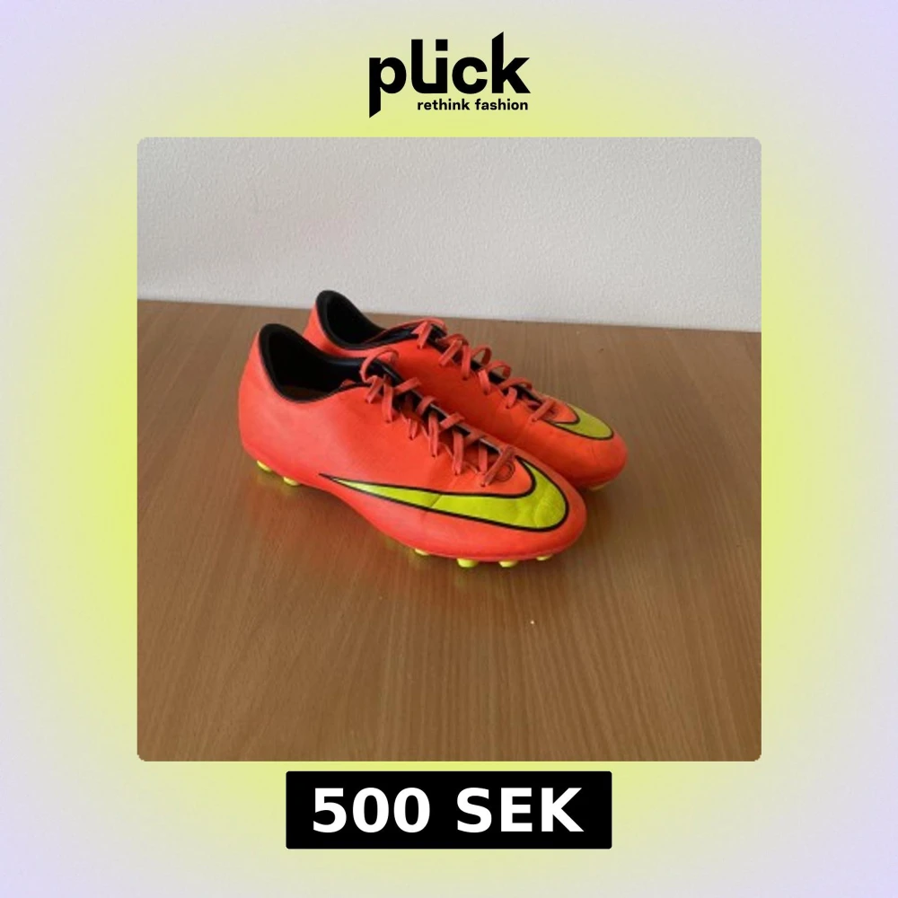 Säljer ett par Nike Mercurial fotbollsskor i en riktigt snygg orange färg med gula och svarta detaljer. Skorna har snörning och platt sula med gula dobbar för gräsplan. Ovandelen är i syntetmaterial och har en smal, sportig form. Perfekt för dig som vill sticka ut på planen. Änvända i cirka 1 år pris kan diskuteras