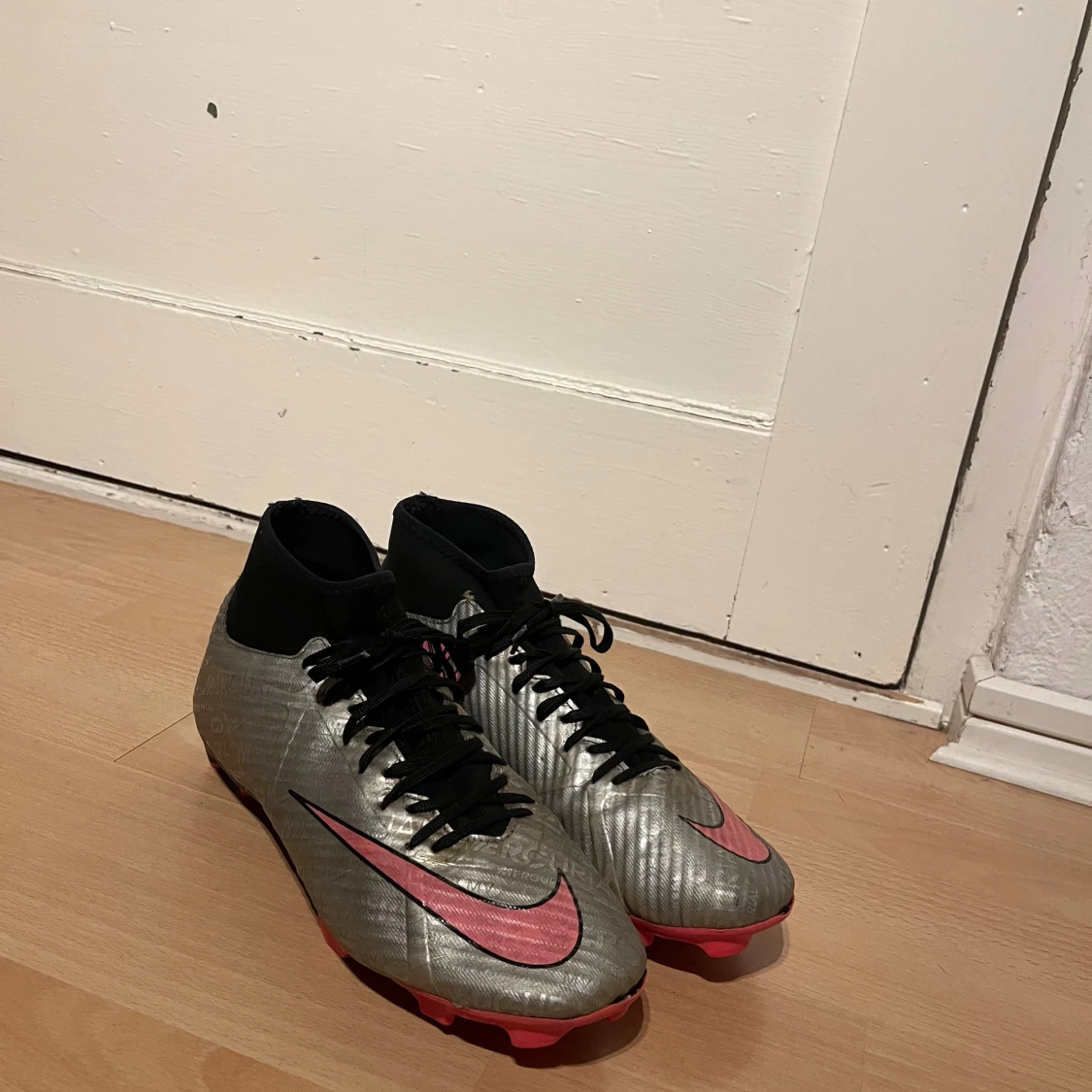 Snygga Nike Mercurial fotbollsskor i silver med rosa swoosh och svarta detaljer. Skorna har högre strumpkrage för extra stöd, svarta snören och rosa dobbar. Perfekta för dig som vill sticka ut på planen med stil och komfort.