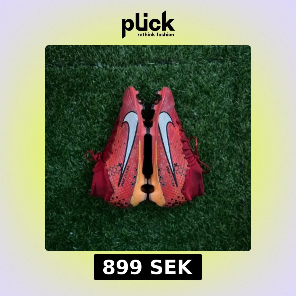 Säljer ett par röda Nike fotbollsskor med svart och vit swoosh på sidorna. Skorna har snörning och en platt sula med dobbar, perfekt för spel på gräs. Orange och svarta detaljer ger en sportig look. (Skick 8/10)