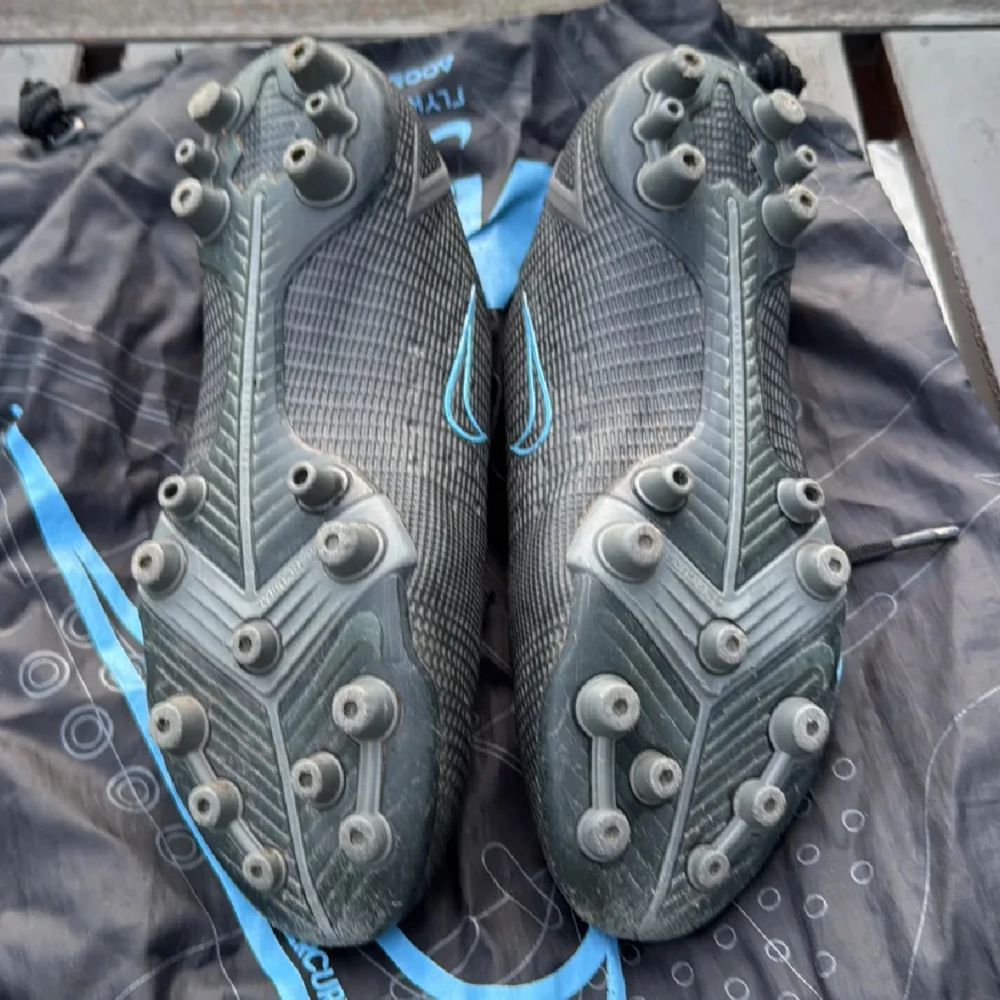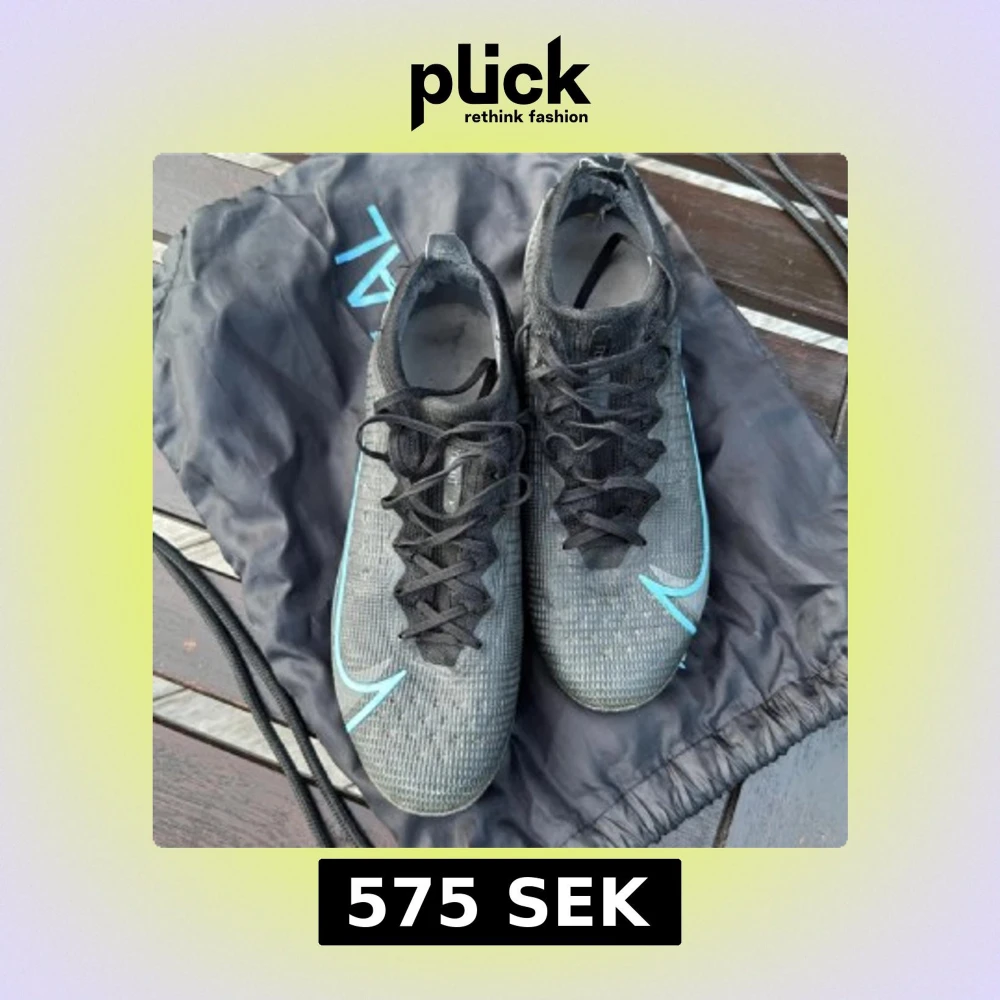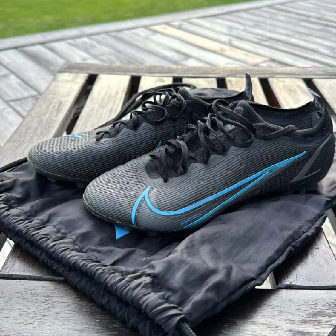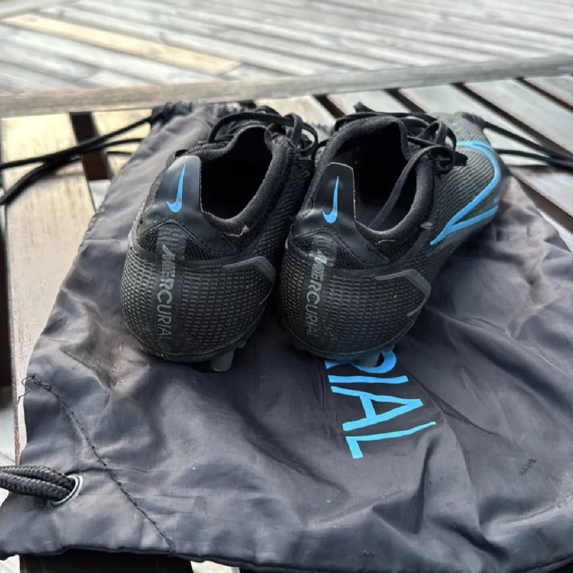 Säljer ett par Nike Mercurial fotbollsskor i svart med blå detaljer och snörning. Sälj då dem är för små! Skorna är i använt skick men har många timmar kvar i sig! Bagen ingår, Skriv vid fler funderingar:)