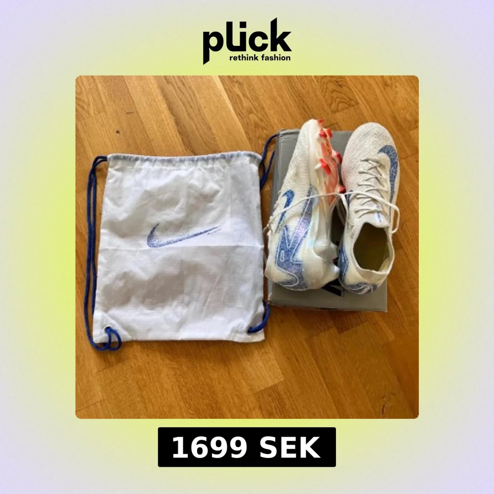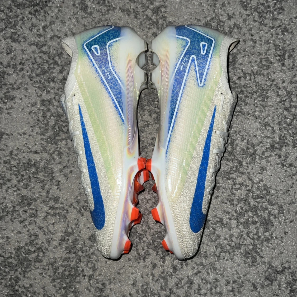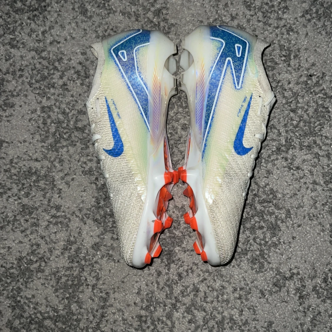Säljer ett par Nike Mercurial vapor 16. Skorna är vita med blå detaljer och har en stickad ovandel samt snörning. Sulan är iriserande med orange Fg dobbar för gräsplan. Kommer med originalpåse och låda. Riktigt lätta och snygga skor för dig som vill sticka ut på planen.