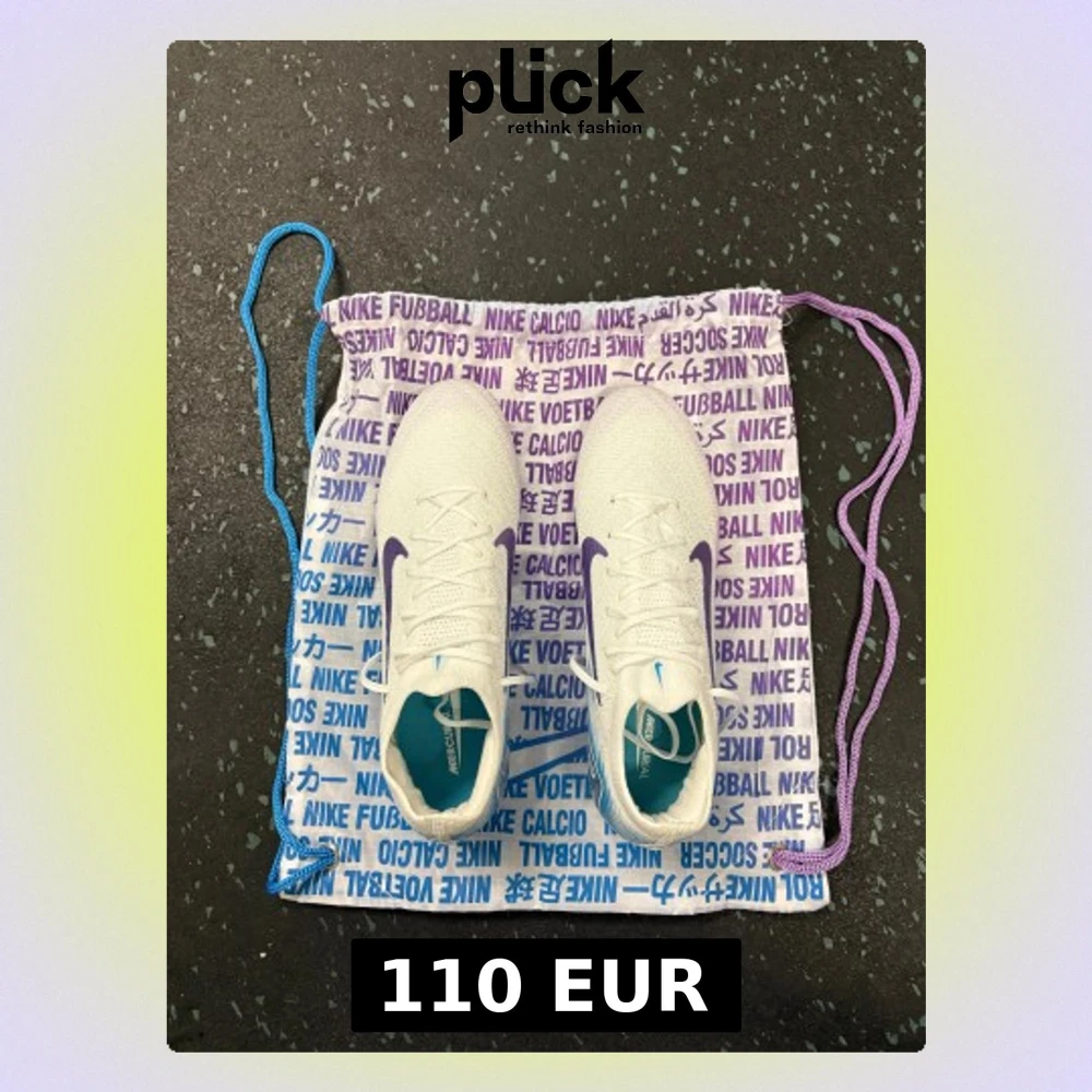 Nike Mercurial fotbollsskor i vit med lila swoosh och blå detaljer. Skorna har snörning, spetsig tå och en platt sula med blå och lila mönstrad undersida. Ovandelen är i syntetmaterial för lätt vikt och bra grepp på planen. Perfekt för dig som vill sticka ut med stil på fotbollsplanen. Size 40 fits 40.5, used once, limited edition