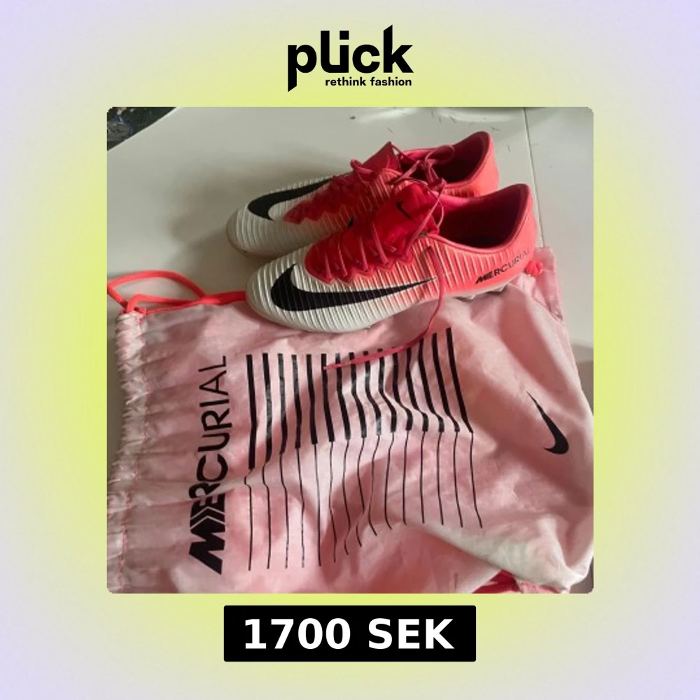 Säljer ett par Nike Mercurial fotbollsskor i en snygg rosa och vit färg med svarta detaljer. Skorna har snörning, låg profil och en rund tå. Yttermaterialet är syntet och designen har ribbade linjer för extra grepp. Perfekt för dig som vill sticka ut på planen!