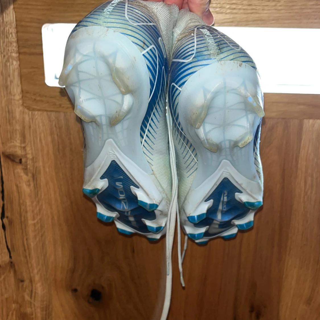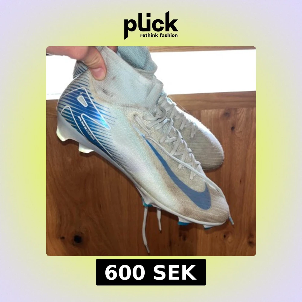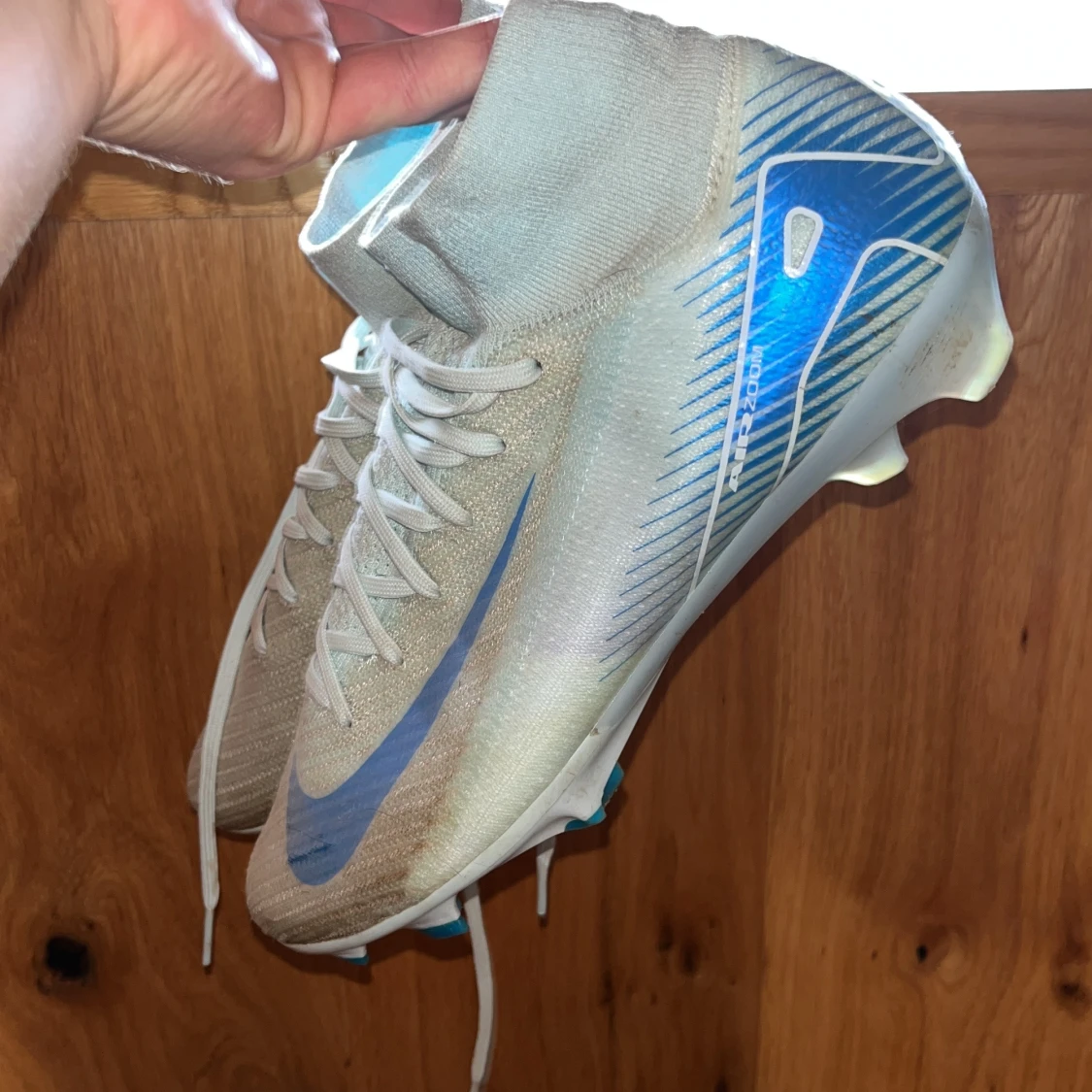 Nike Mercurial Zoom fotbollsskor i ljusbeige och blått med högt skaft och snörning. Snyggt mönstrad med blå detaljer och Nike-logga på sidan. Skorna har platt sula med dobbar för gräsplan och är tillverkade i syntetmaterial för lätt känsla och bra grepp. Ingen påse.