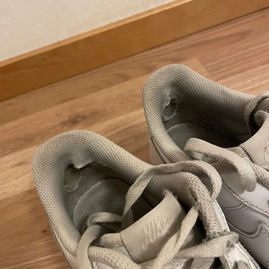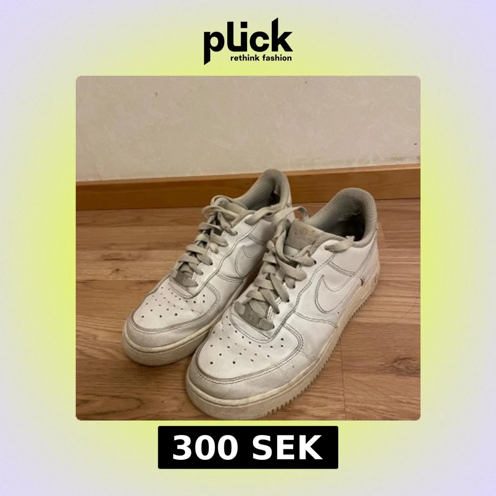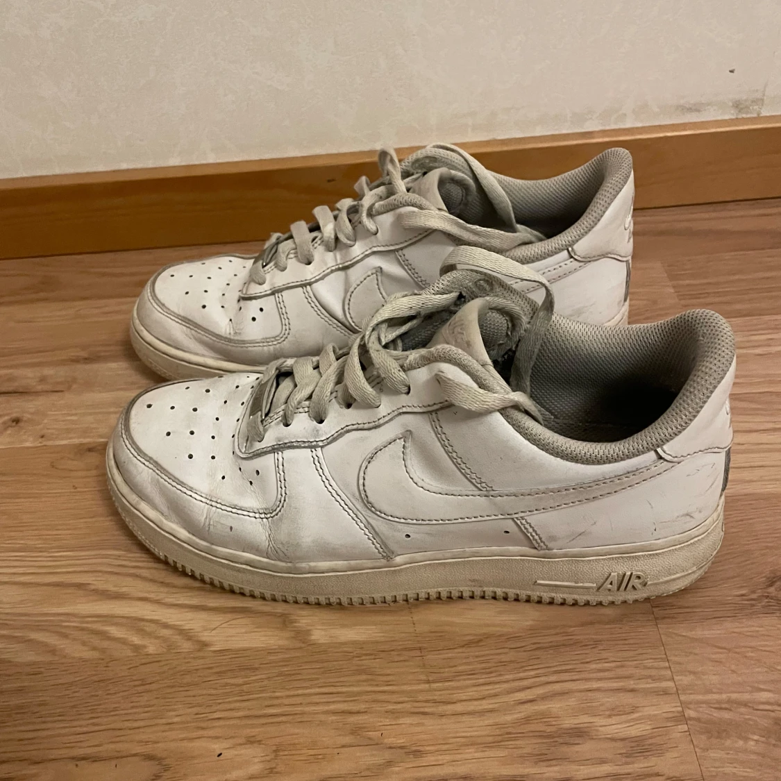 Säljer ett par klassiska vita Nike Air Force sneakers. De har en ikonisk design med snörning och perforerade detaljer på ovansidan för ventilation. Perfekta för en stilren look. De är lite slitna där bak men man tänker inte på det