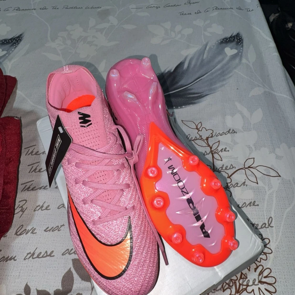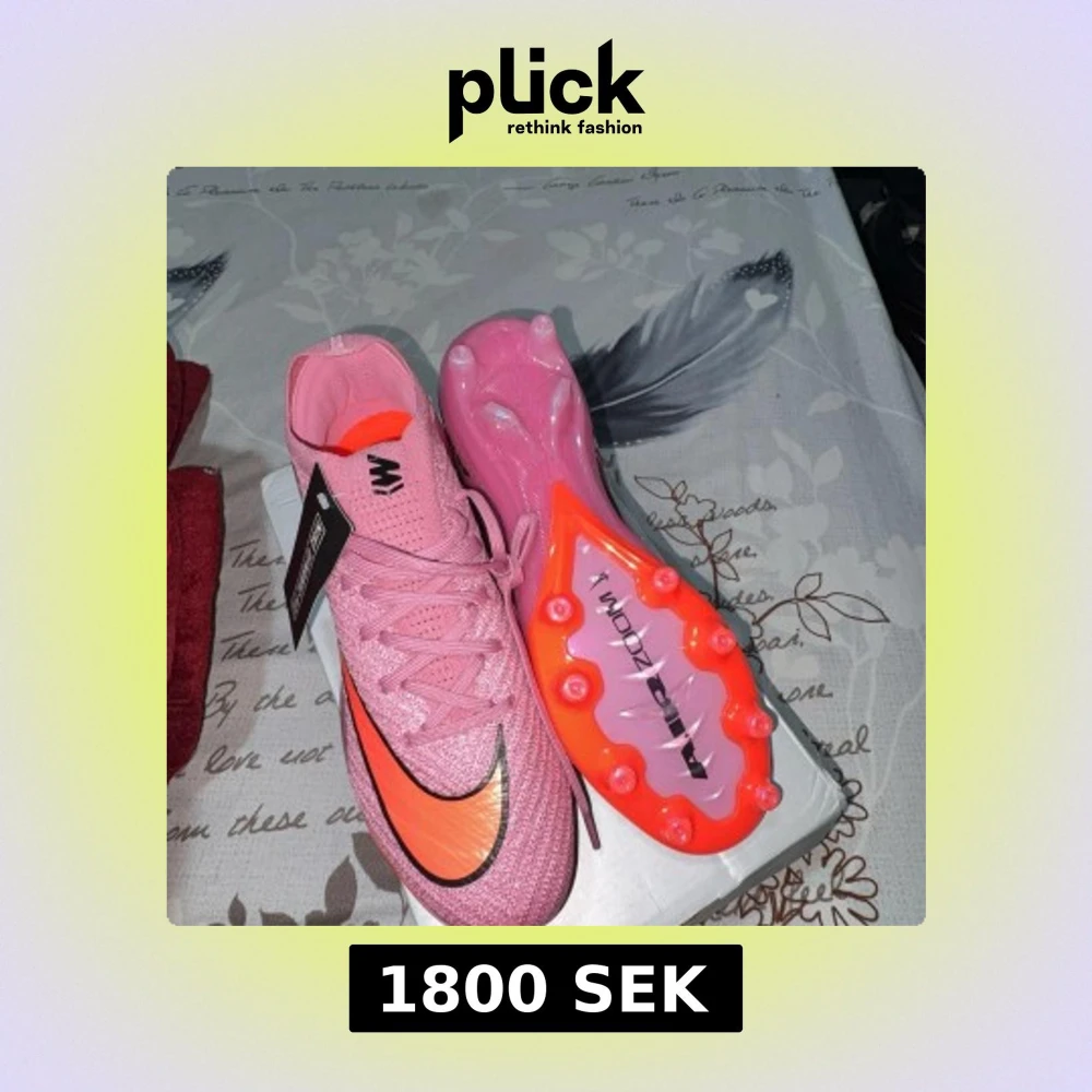 Säljer ett par Nike Mercurial fotbollsskor i en snygg rosa färg med orange och svart swoosh. Skorna har snörning, platt sula med dobbar och är tillverkade i syntetmaterial. Perfekta för dig som vill sticka ut på planen!