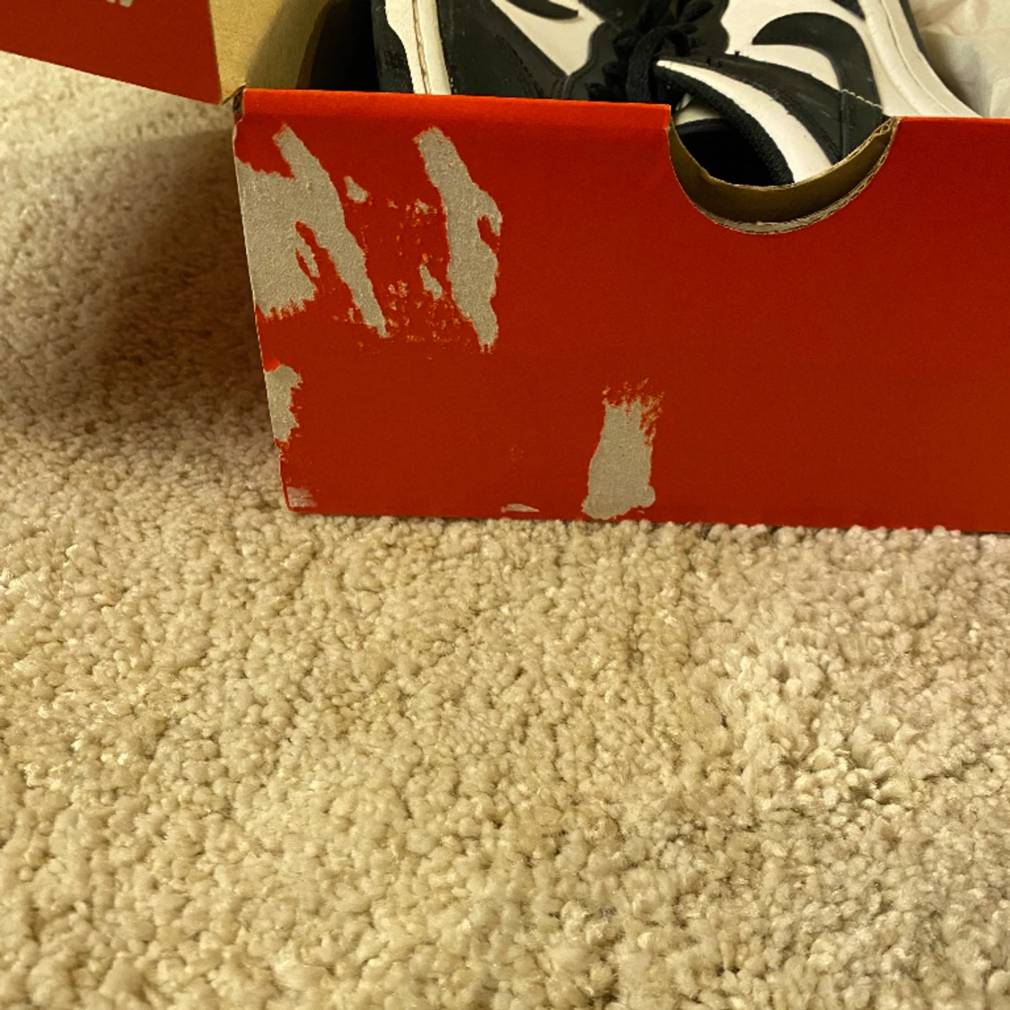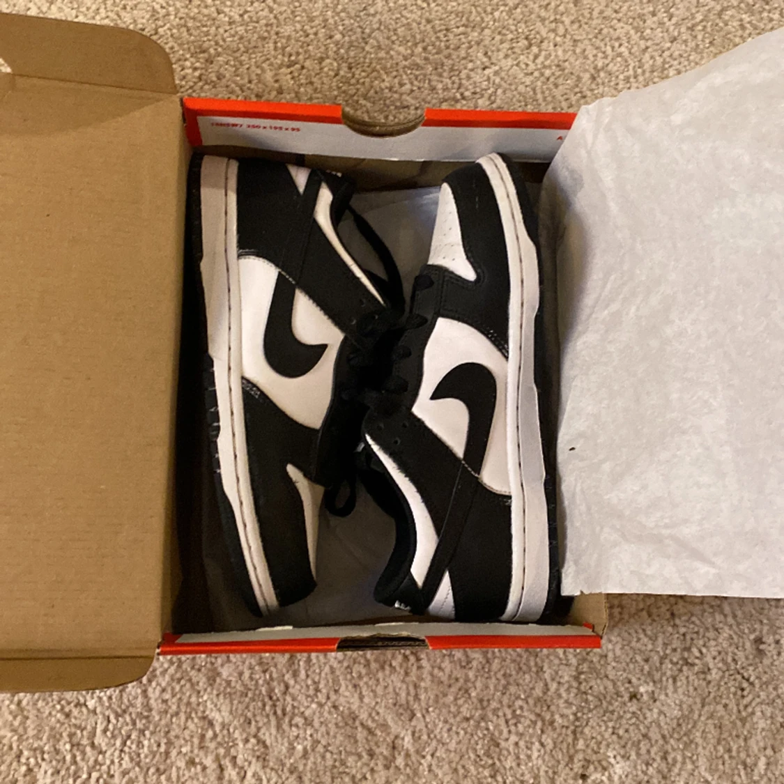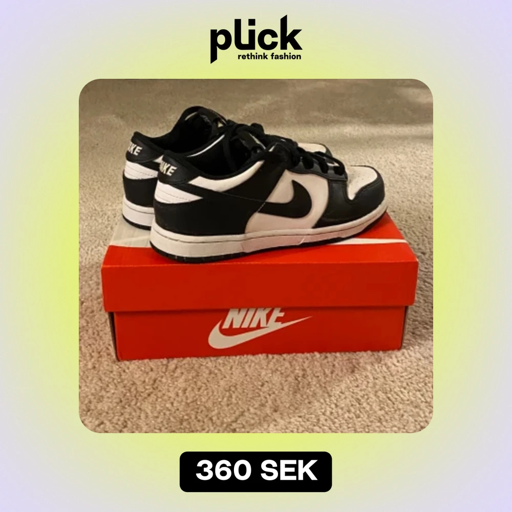 Hej jag sälger mina panda dunks för att de är för små. Deras skick är 8/10 och har andvänts fåtal gånger. De har andvänts i ett år ungefär. Man kan se en skada på kartongen på bild tre men den är inte så stor.😁