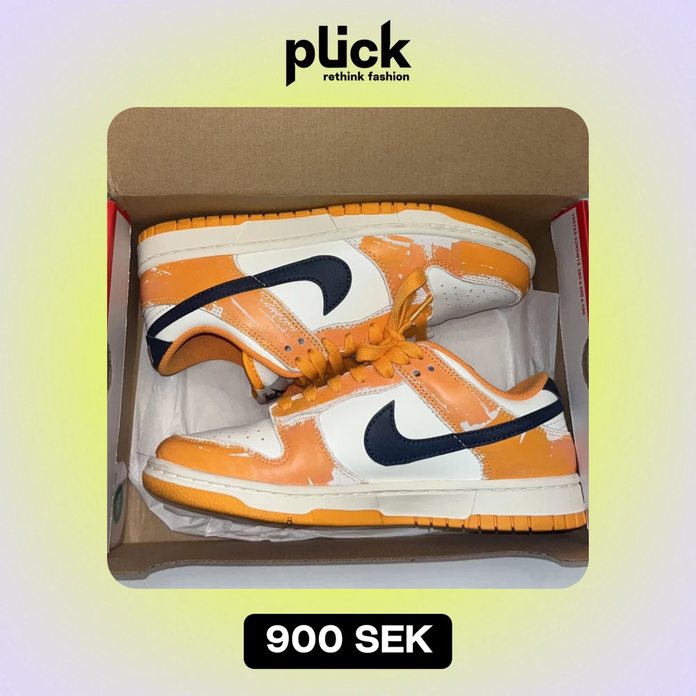 Oranga dunks, använda 1 gång innan. Helt nytt skick. I storlek 38,5 funkar för folk med storlek 38/39. Kommer med lådan. Köpte på zalando. (OBS skorna är inte slitna det är modellen på skon, dom ska se ut så)
