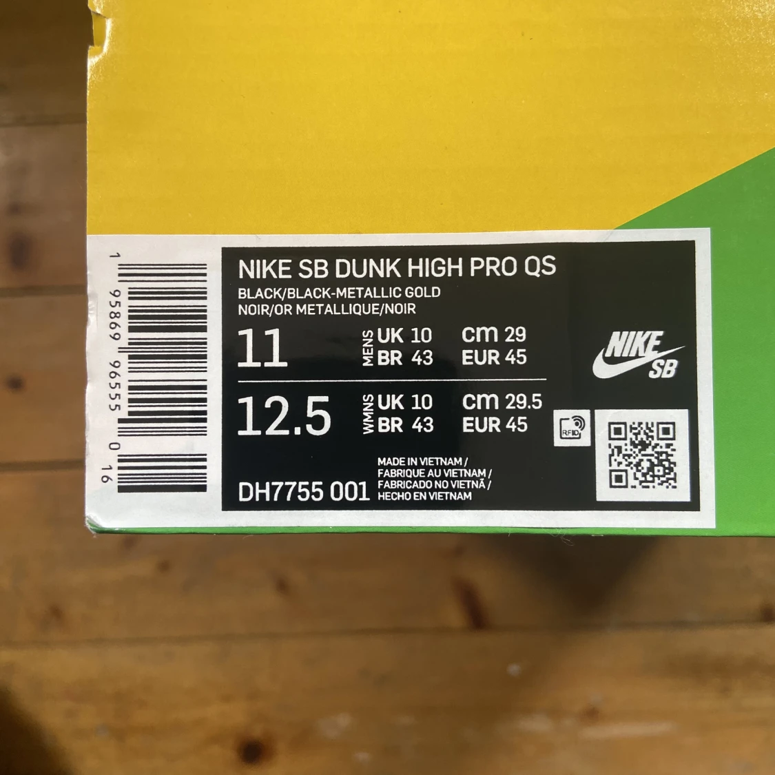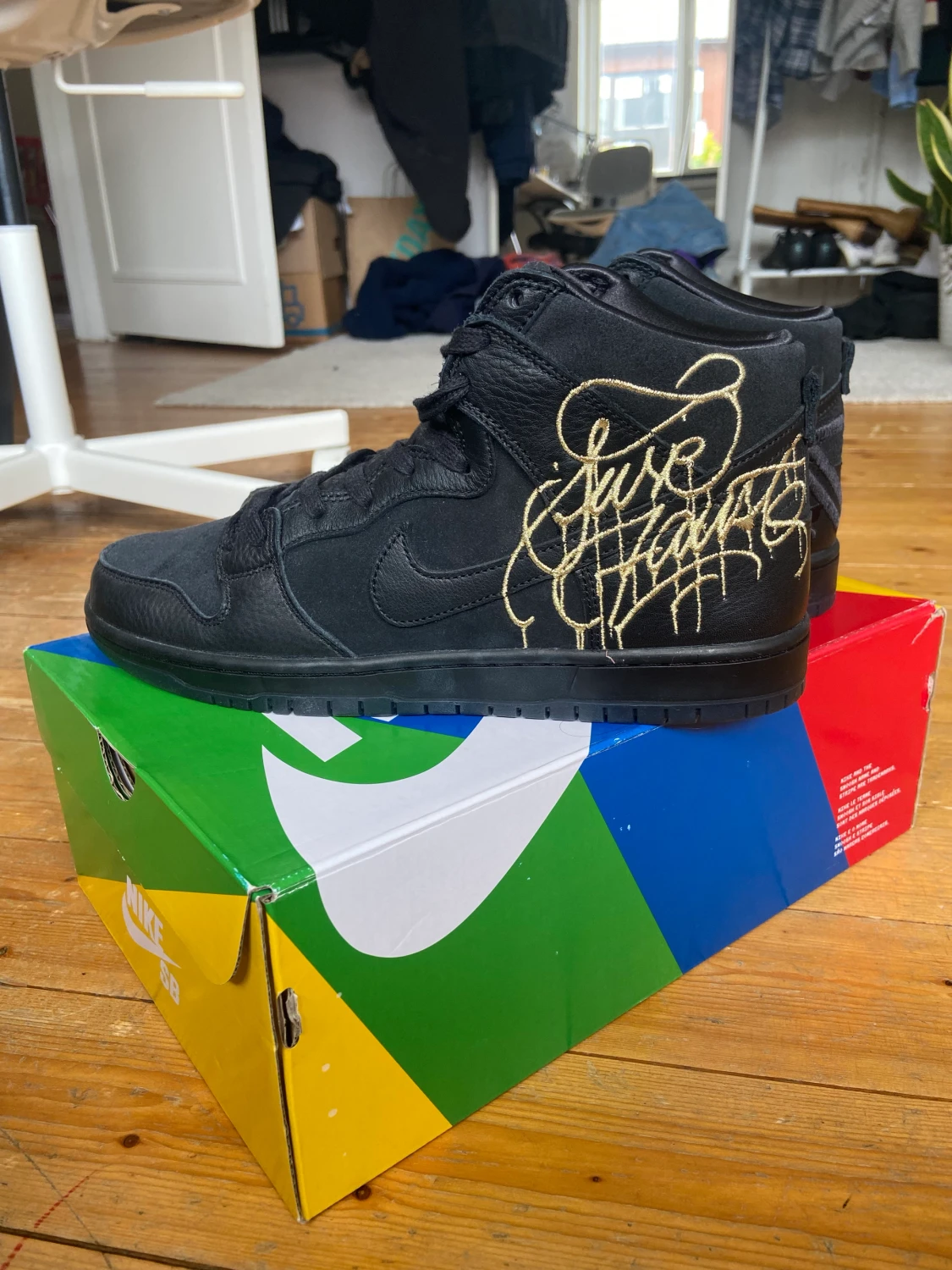 Nike SB Dunk High FAUST Black Gold Skorna är helt nya och aldrig använda, skriv om du vill ha fler bilder på skorna. Köparen står för fraktkostnaden