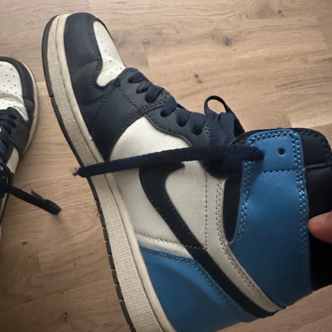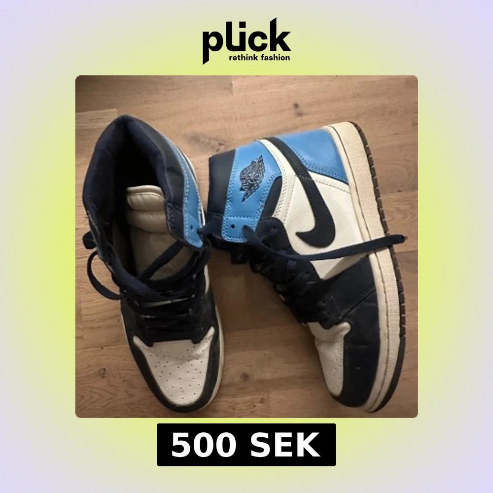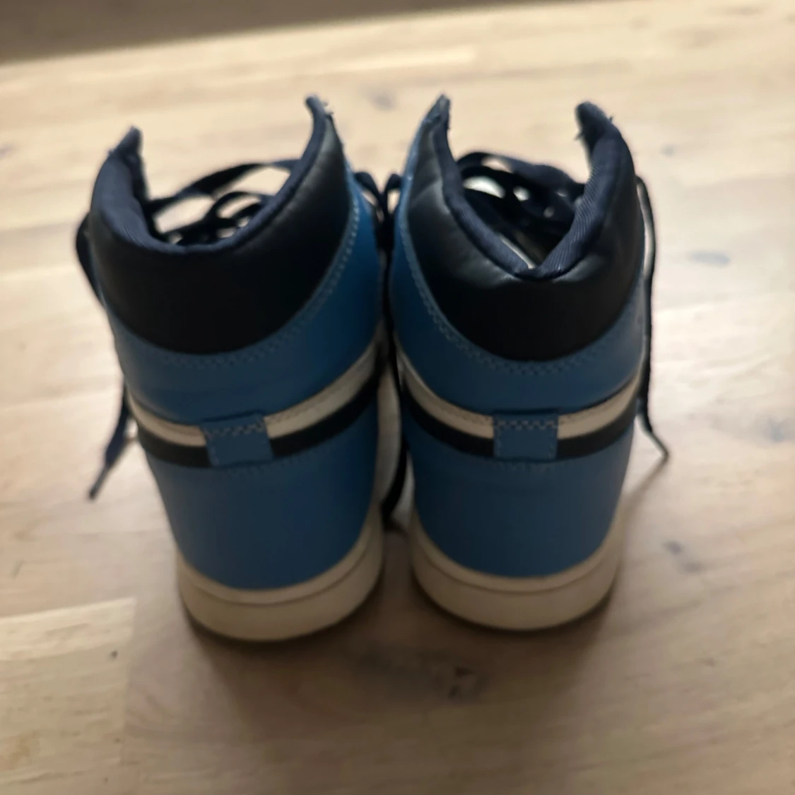 Snygga Nike Air Jordans i en fräsch kombination av blått, vitt och svart. Skorna har klassisk snörning och den ikoniska Air Jordan-loggan på sidan. Perfekta för dig som vill ha en stilren och sportig look.