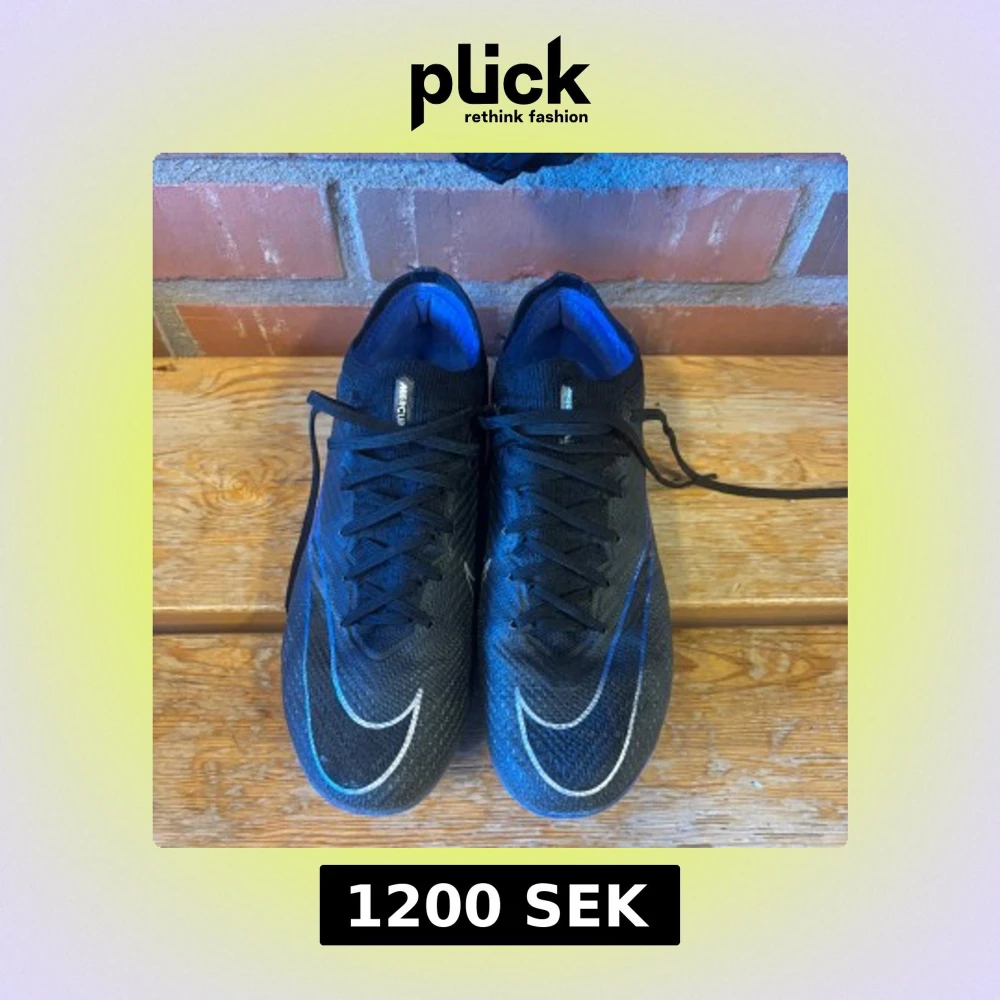 Säljer ett par Nike Mercurial fotbollsskor i svart med blå och vita detaljer. Skorna har snörning, rund tå och platt sula med dobbar för bra grepp på planen. Perfekta för dig som vill ha lätta och snabba skor till fotbollsträningen.