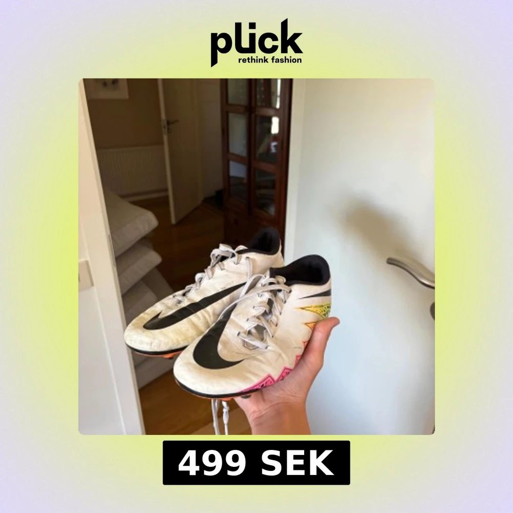 Säljer ett par vita Nike fotbollsskor med stora svarta swoosh-loggor och coola färgdetaljer i gult, rosa och orange på sidorna och hälen. Skorna har snörning, svart foder och mönstrad häl. Perfekta för dig som vill sticka ut på planen!