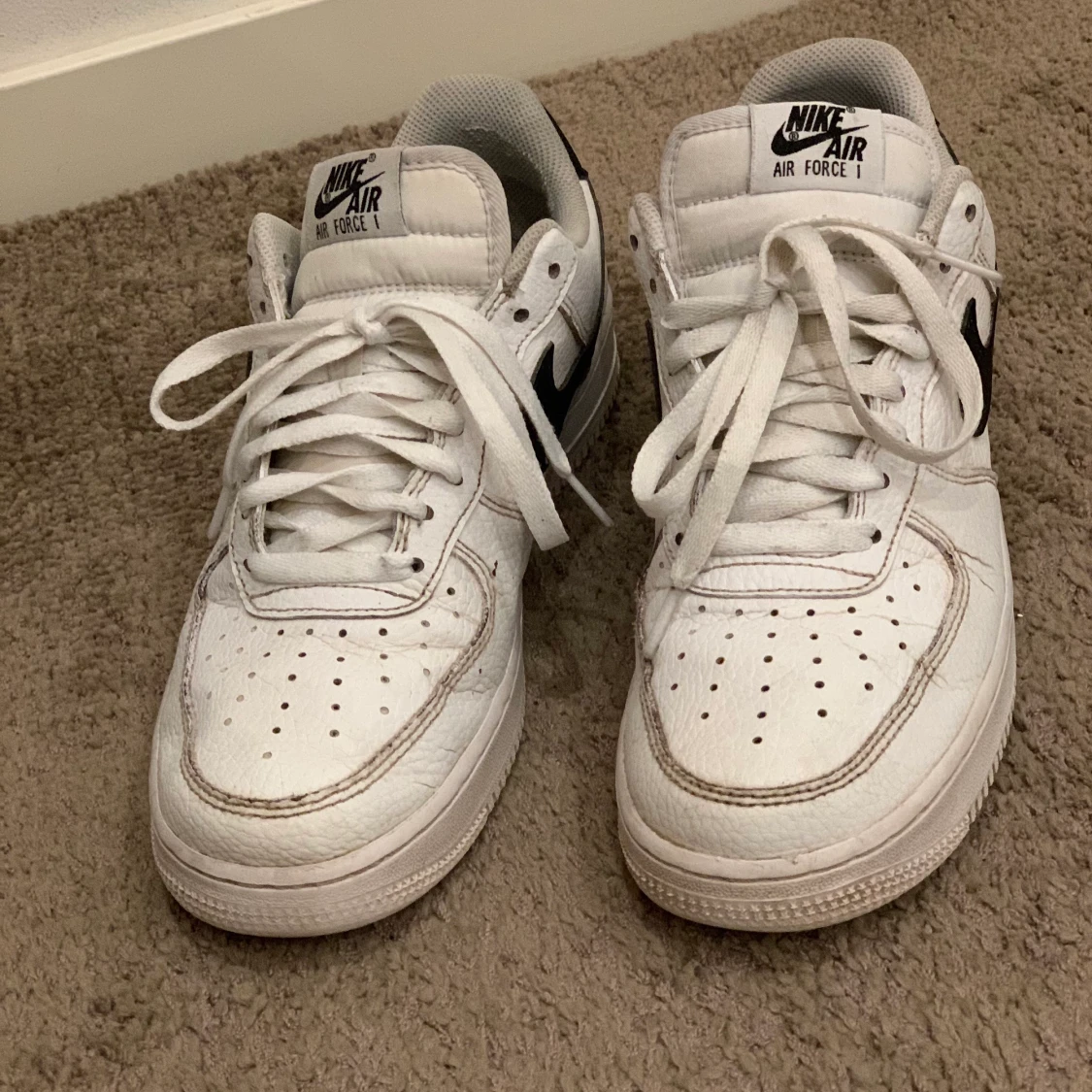 Air force one med svart swoosh, storlek 41. Rätt så väl använda, skick 7/10. Endast lite sliten vid insidan av ena skon (inget som syns) Köpta på footlocker, ordinarie pris 1349kr.