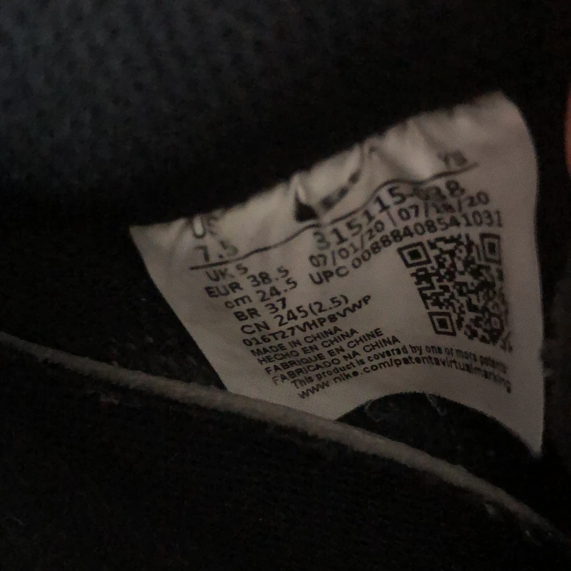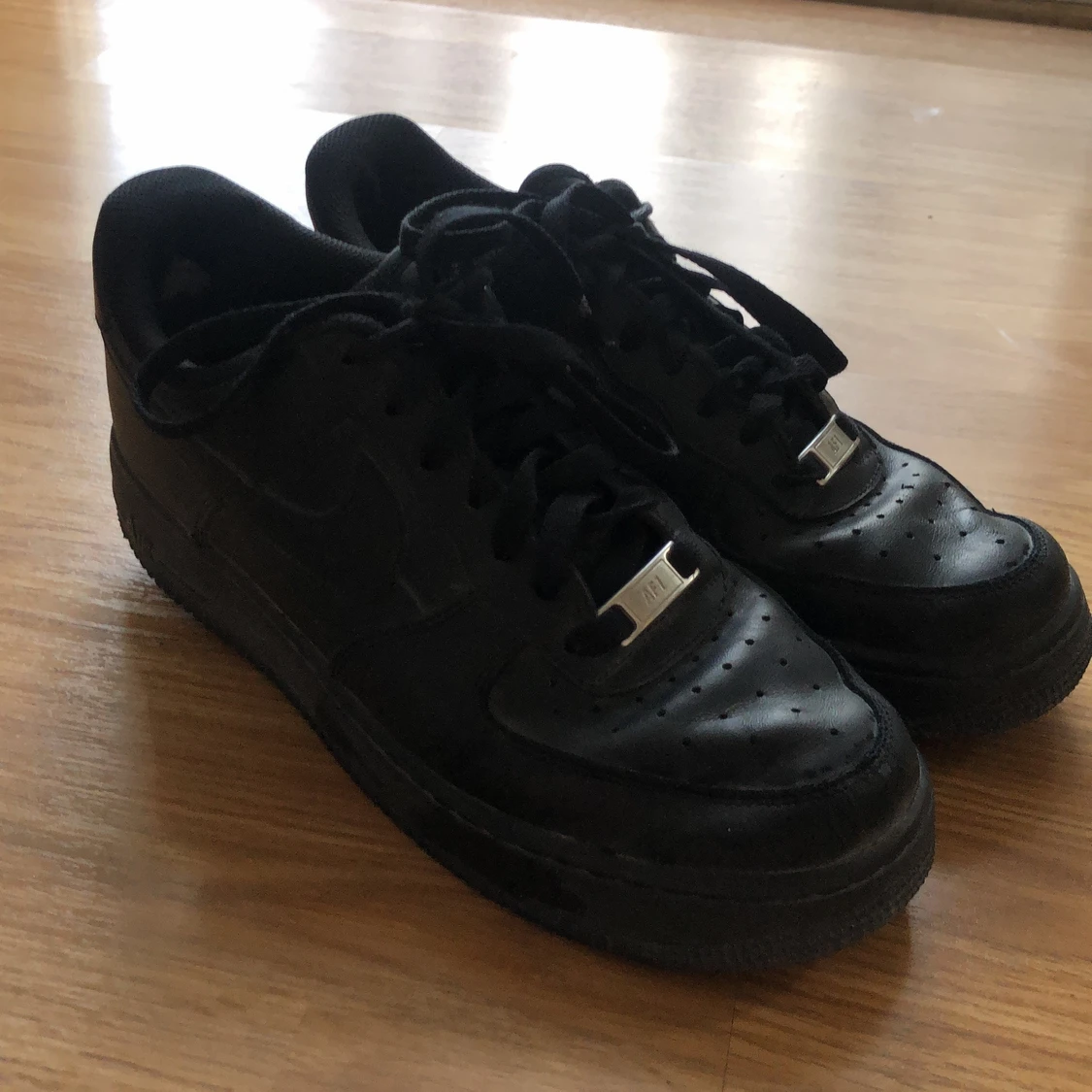 Svarta Nike airforce 1. Köpt för ca 1 år sedan. Helt okej skick. Ett hål i hälen på båda skorna. Men inget man märker av. Skosnören kan behöva bytas. Men jag rengör de såklart vid köp. Går såklart att diskutera pris💖😊