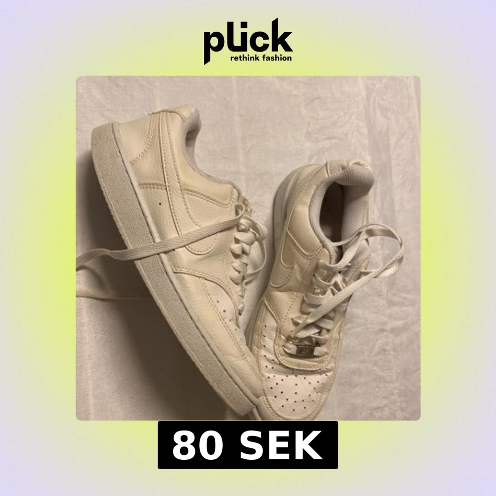 Säljer ett par klassiska vita Nike Air sneakers. De har en stilren design med perforerade detaljer på tån och snörning framtill. Perfekta för en casual look. Bra skick men använda. Enda som är lite trasigt är tyget på insidan (se bild) men det märks knappast när skorna är på fötterna.