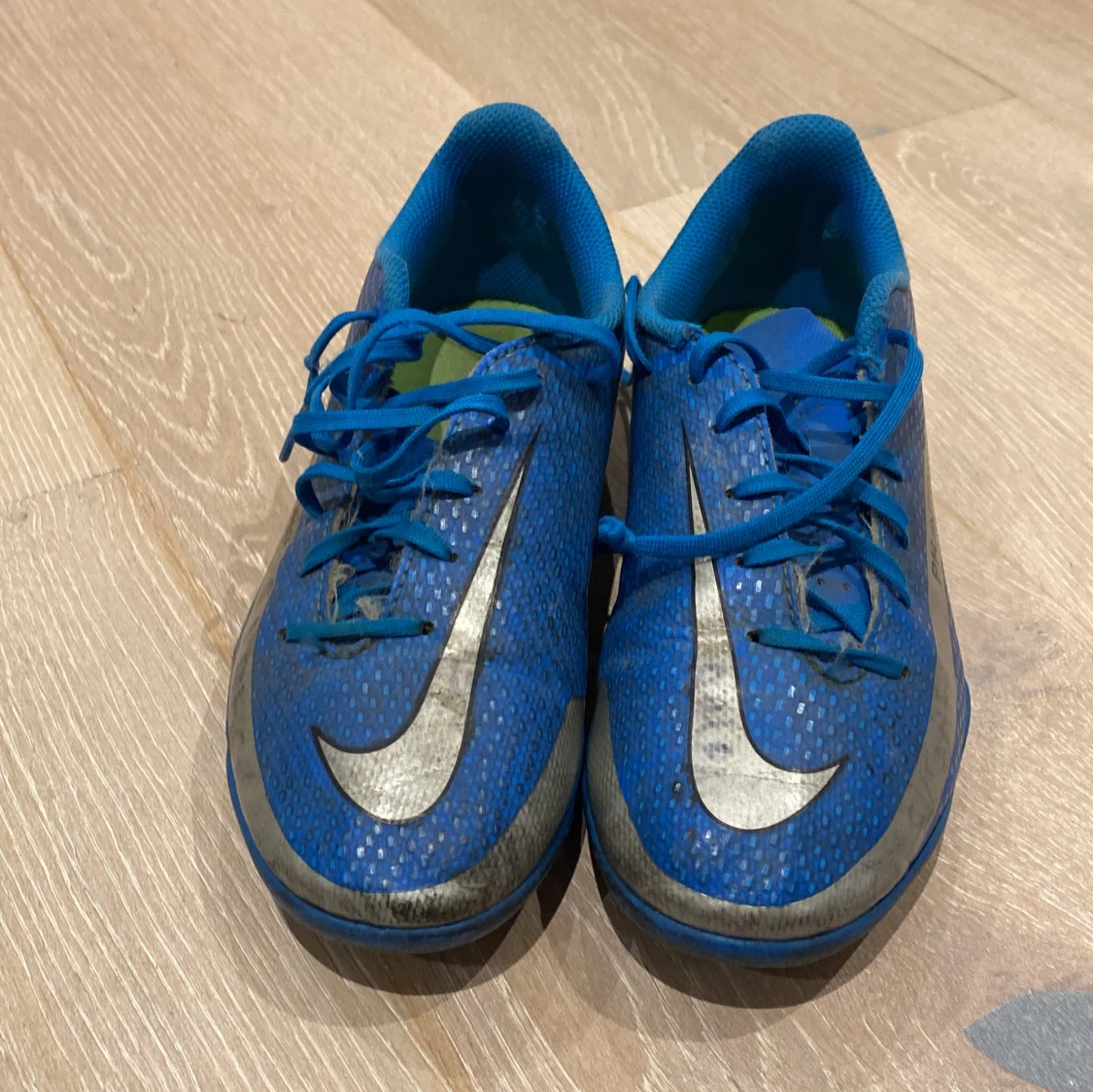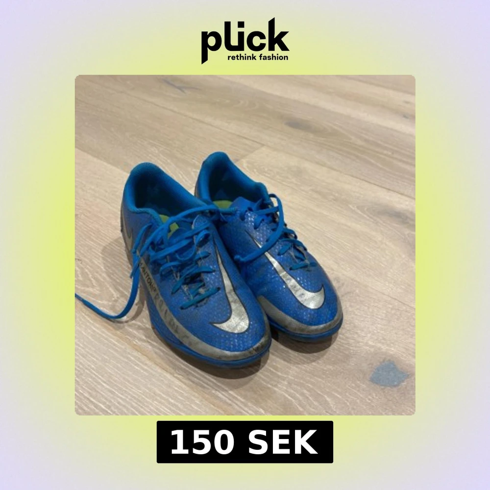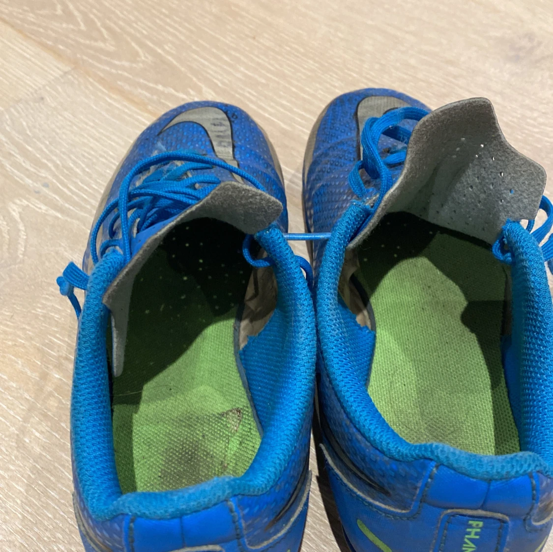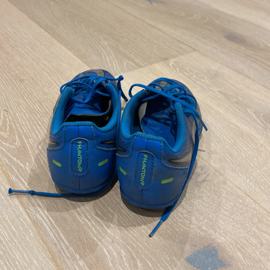 Säljer ett par Nike Phantom fotbollsskor i blått med silverfärgade detaljer och snörning. Skorna har en sportig look med rund tå och är tillverkade i syntetmaterial. Perfekta för dig som älskar fotboll och vill sticka ut på planen.
