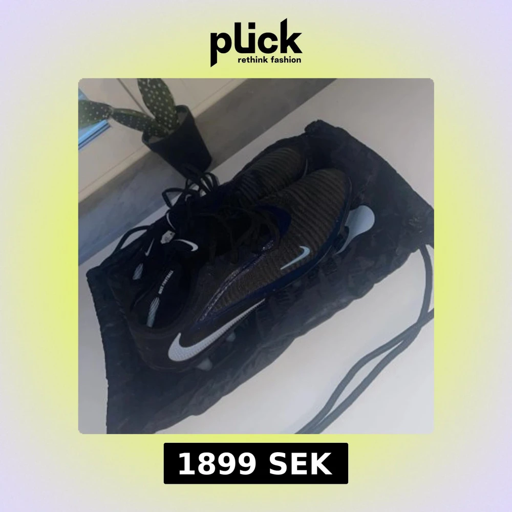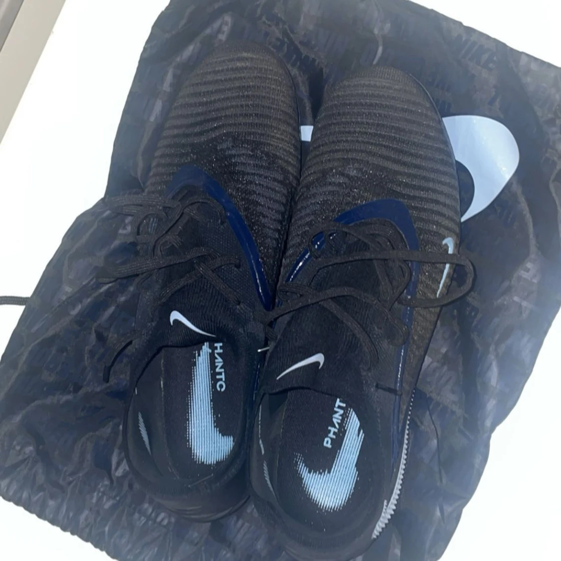 Säljer ett par Nike Phantom fotbollsskor i svart med blå detaljer och vita Nike-loggor. Skorna har snörning och ribbad ovandel i syntetmaterial för extra grepp. Sulan har fasta dobbar och är designad för spel på gräs. Medföljer en svart Nike-påse. Har använt skorna 3 gånger så sjukt bra skick för sjukt bra pris 🔥