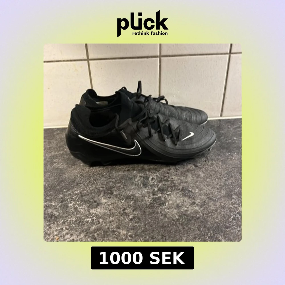 Säljer ett par svarta fotbollsskor från Nike med snörning och vit Nike-logga på sidan. Skorna har en strömlinjeformad design och är perfekta för fotbollsplanen.
