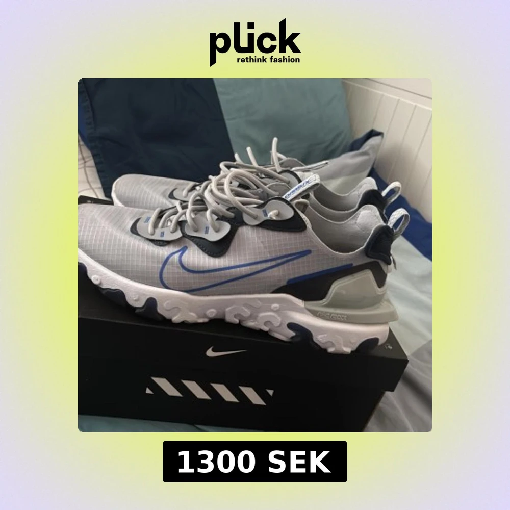 Nike React Element sneakers i ljusgrått med blå detaljer och vit sula. Skorna har en modern design med synliga sömmar, stora snörhål och en vågig, dämpad sula. Materialet är syntet och mesh för en sportig vibe. Perfekta för dig som gillar streetstyle och bekväma skor.