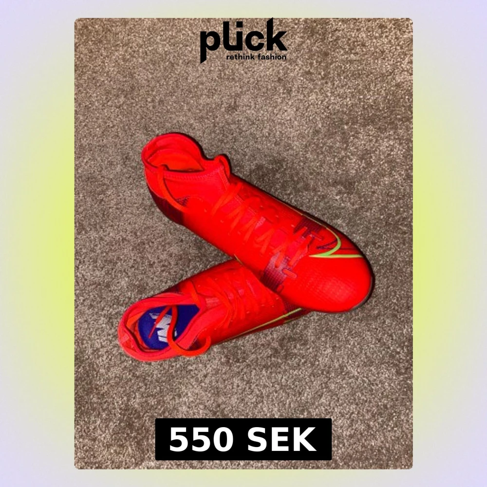 Säljer ett par grymma Nike fotbollsskor i starkt röd färg med coola gröna och svarta detaljer. Skorna har snörning och en platt sula med dobbar i orange och silver, perfekt för spel på gräs. Materialet är syntet och designen är riktigt sportig och modern.