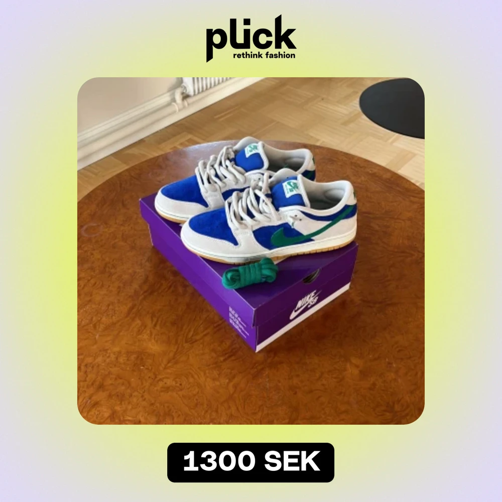 Ett par helt nya sb dunks phantom/malachite-hyper royal size 9.5/ eur 43 säljer för att dom är för små Original pris 1450 sek säljer dom för 1300 sek