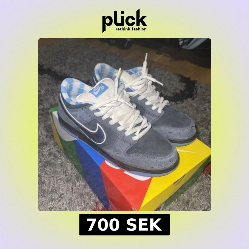Nike SB Dunk blue lobster med grå mocka och blå detaljer. Swoosh i mörkblått med vit kant, vit snörning och unik blå/vit rutig insida. Skorna har platt sula och rund tå, perfekt för dig som gillar streetwear. Använda 1-2 ggr nyskick.