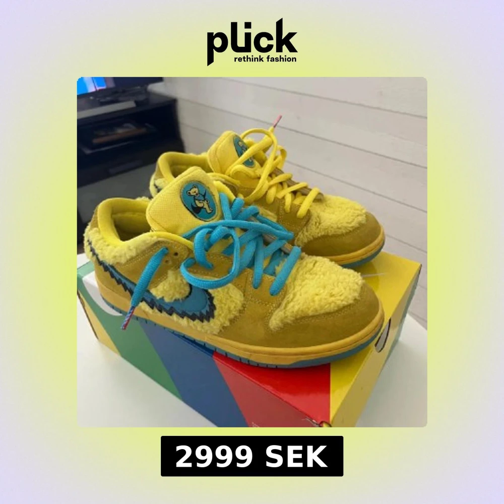 Unika Nike SB Dunk Low Grateful Dead i gult med blå detaljer. Skorna har pälsliknande material på ovandelen, blå och gula snören, samt blå Nike-logga med taggiga kanter. Tungan pryds av en ikonisk björn. Perfekta för dig som vill sticka ut med färg och cool design.