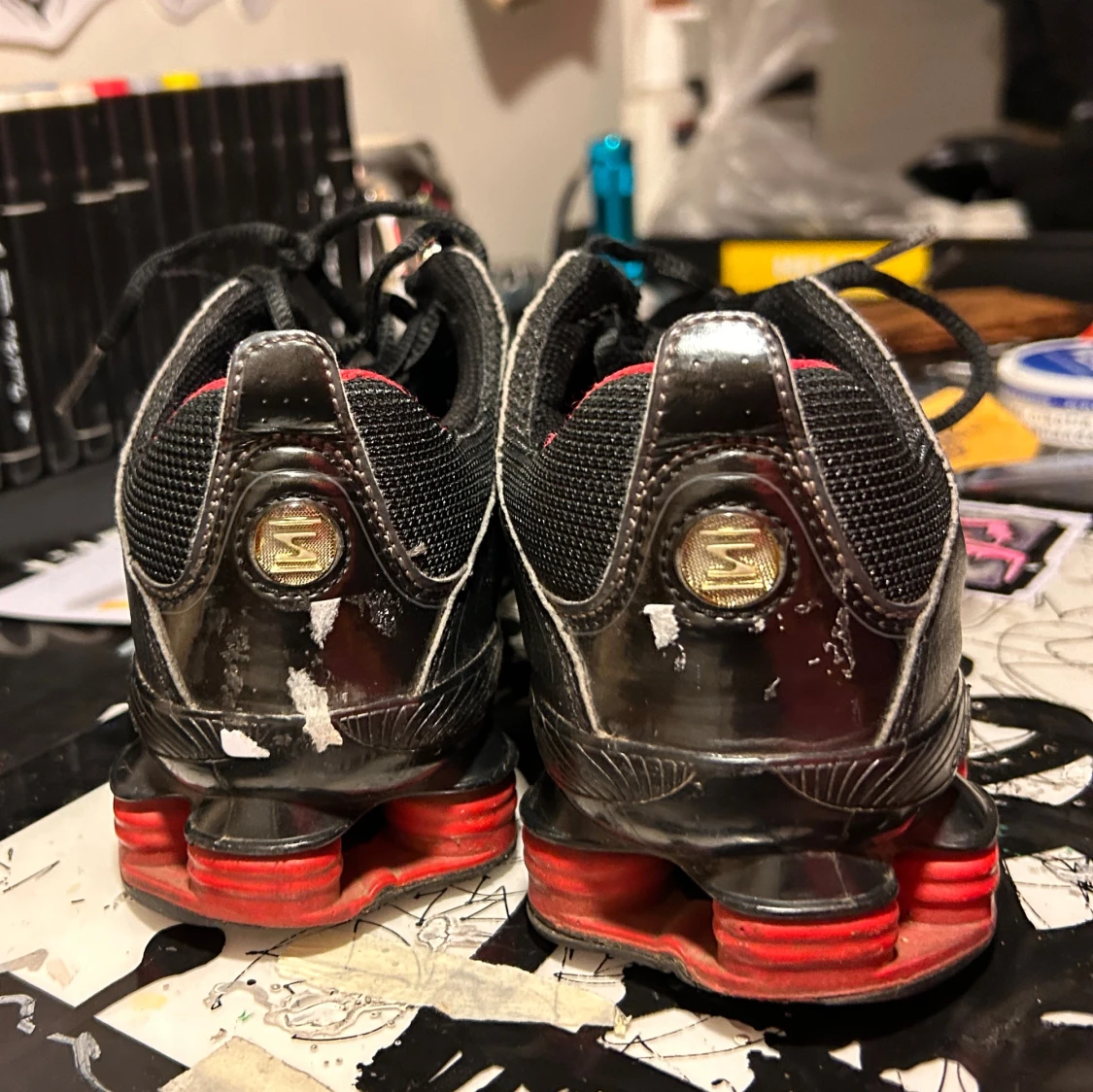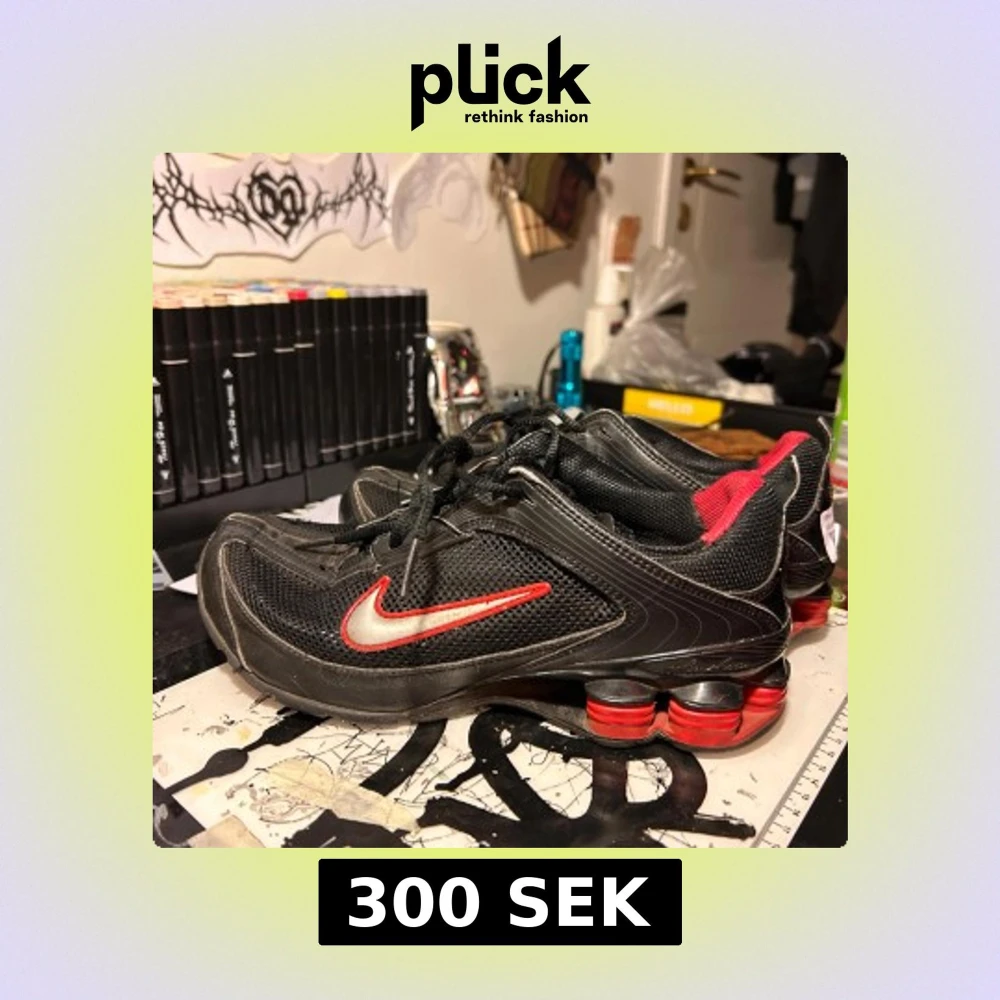 Nike Shox sneakers i svart med röda detaljer och ikonisk fjädrande sula. Ovandel i mesh och syntet, med röd Swoosh på sidan och röda Shox-kolumner i sulan. Skorna har snörning och sportig vibe, perfekta för dig som gillar streetwear.
