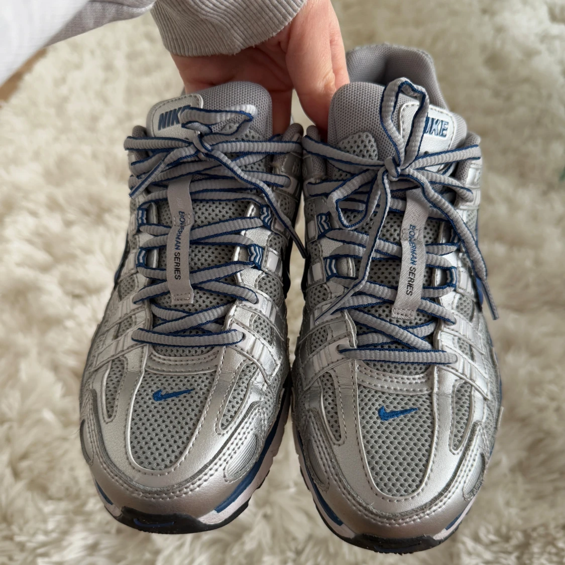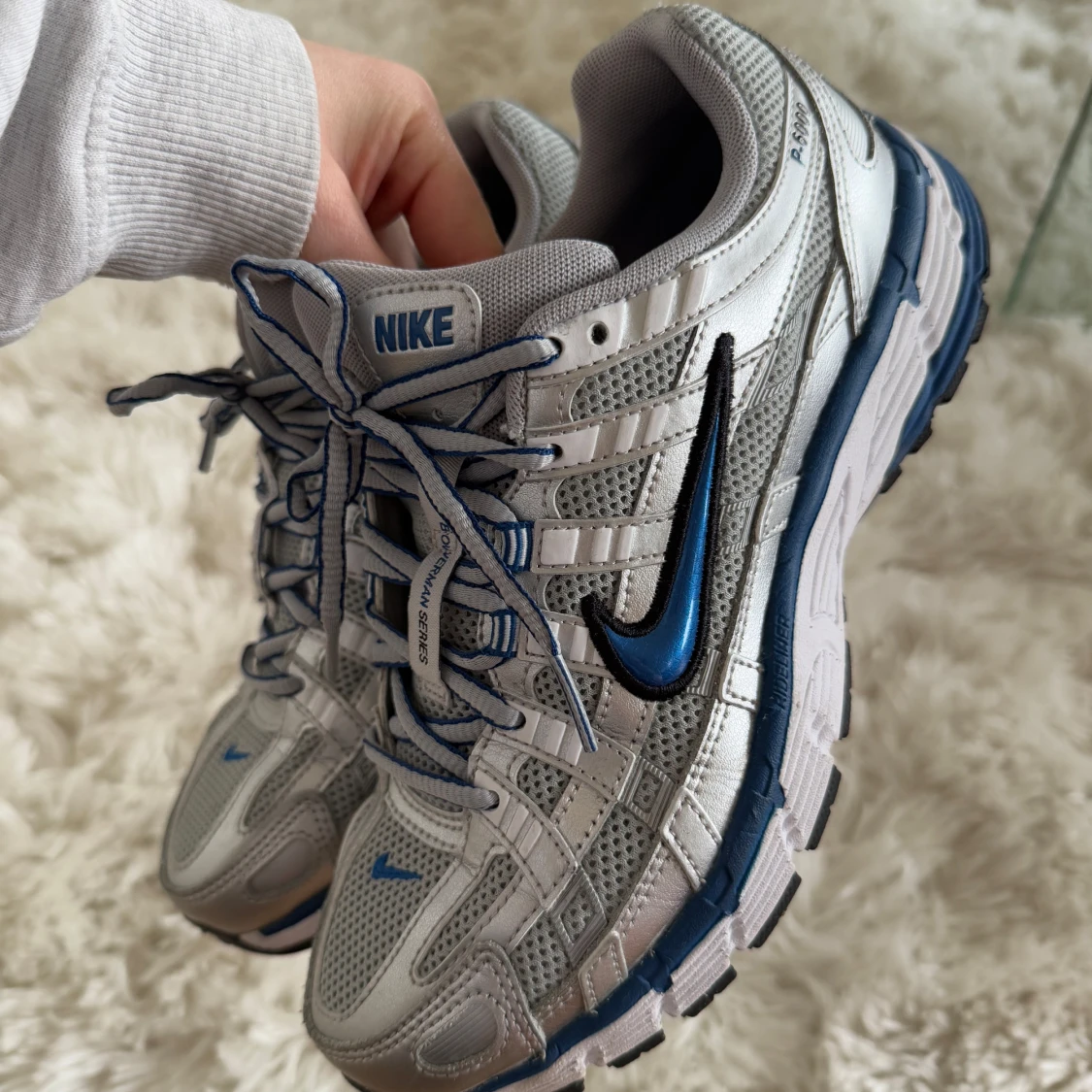 Säljer ett par Nike sneakers i silver med blå detaljer och svart Nike-logga. Skorna har snörning, meshpaneler för andning och en robust sula. Perfekta för både träning och vardagsstil. Klassisk sportig look med modern känsla.