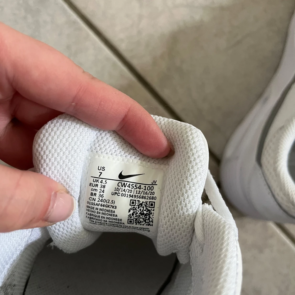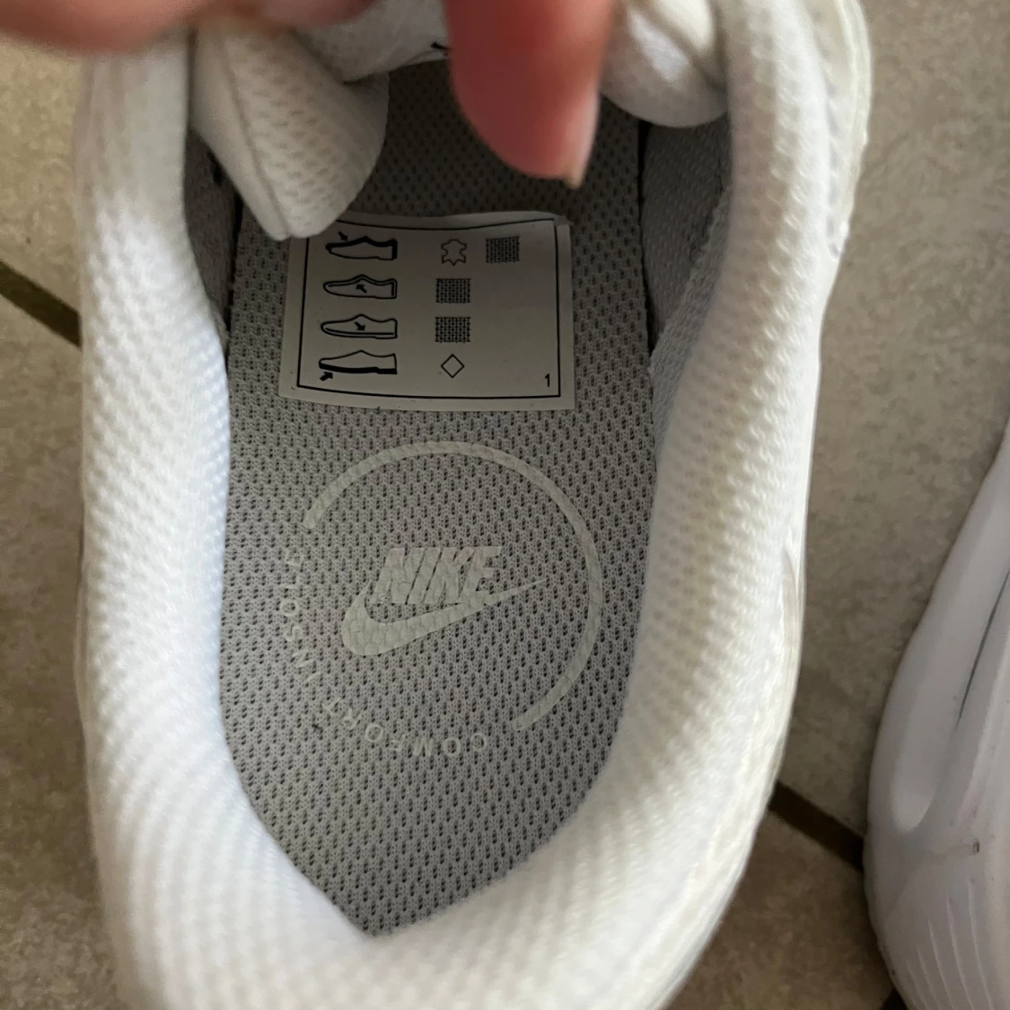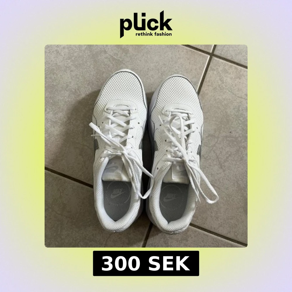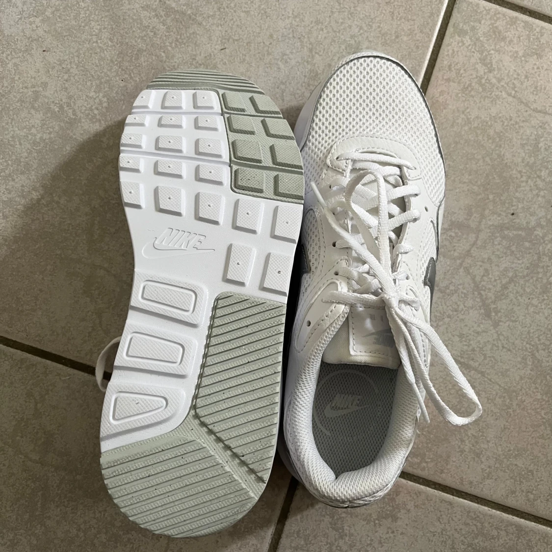 Vita Nike skor med silvrig Nike-logga pĂ„ sidan. Storlek 38, endast testadeđ