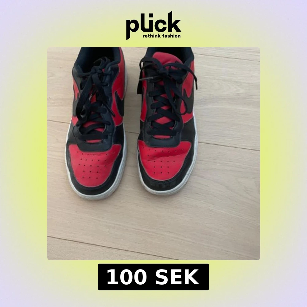 Säljer ett par klassiska Nike sneakers i rött och svart med svart swoosh på sidan. Skorna har snörning och vit sula med röd undersida. Perfekta för dig som gillar streetwear och vill sticka ut med färg.