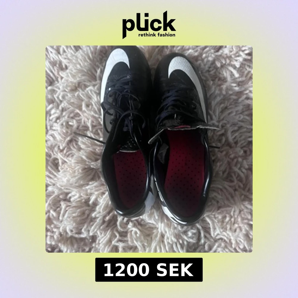 Säljer ett par svarta Nike fotbollsskor med vit swoosh och röda detaljer under sulan. Skorna har snörning och är tillverkade i syntetmaterial med mönstrad yta för extra grepp. Perfekta för dig som vill ha stilrena och funktionella skor på planen. Det är en sällsynt modell som är väldigt eftertraktad