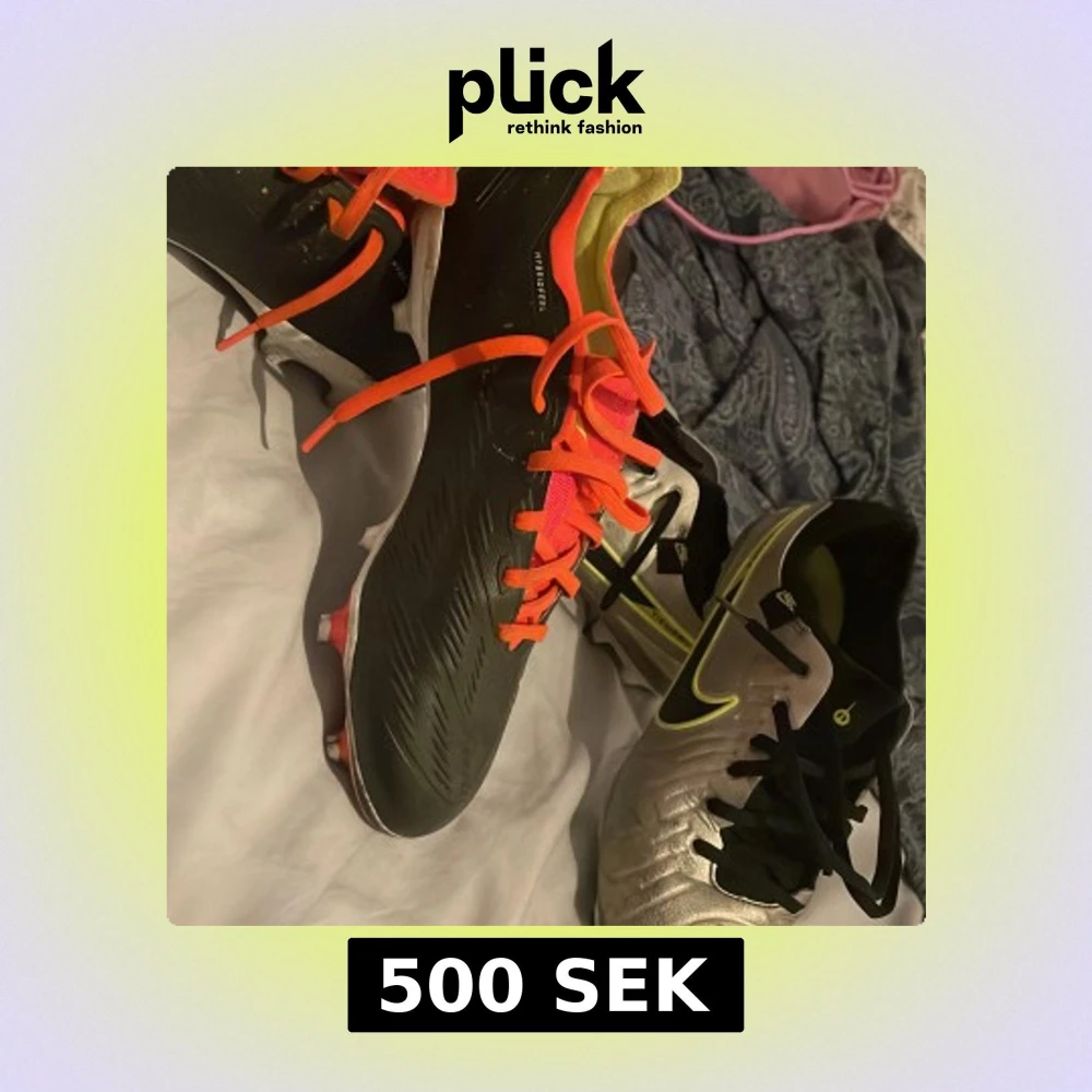 Två par fotbollsskor: Nike Tiempo i silver, svart och neongul med snörning och platt sula, samt Adidas Predator i svart, vitt och rött med orange snören. Båda paren har klassisk design och är perfekta för dig som vill sticka ut på planen. Adidas stl 38 2/3 och Nike är 41. Tiempo är PRO och adidas är academy. Pris kan diskuteras. Kan gå båda för ett bättre pris😉