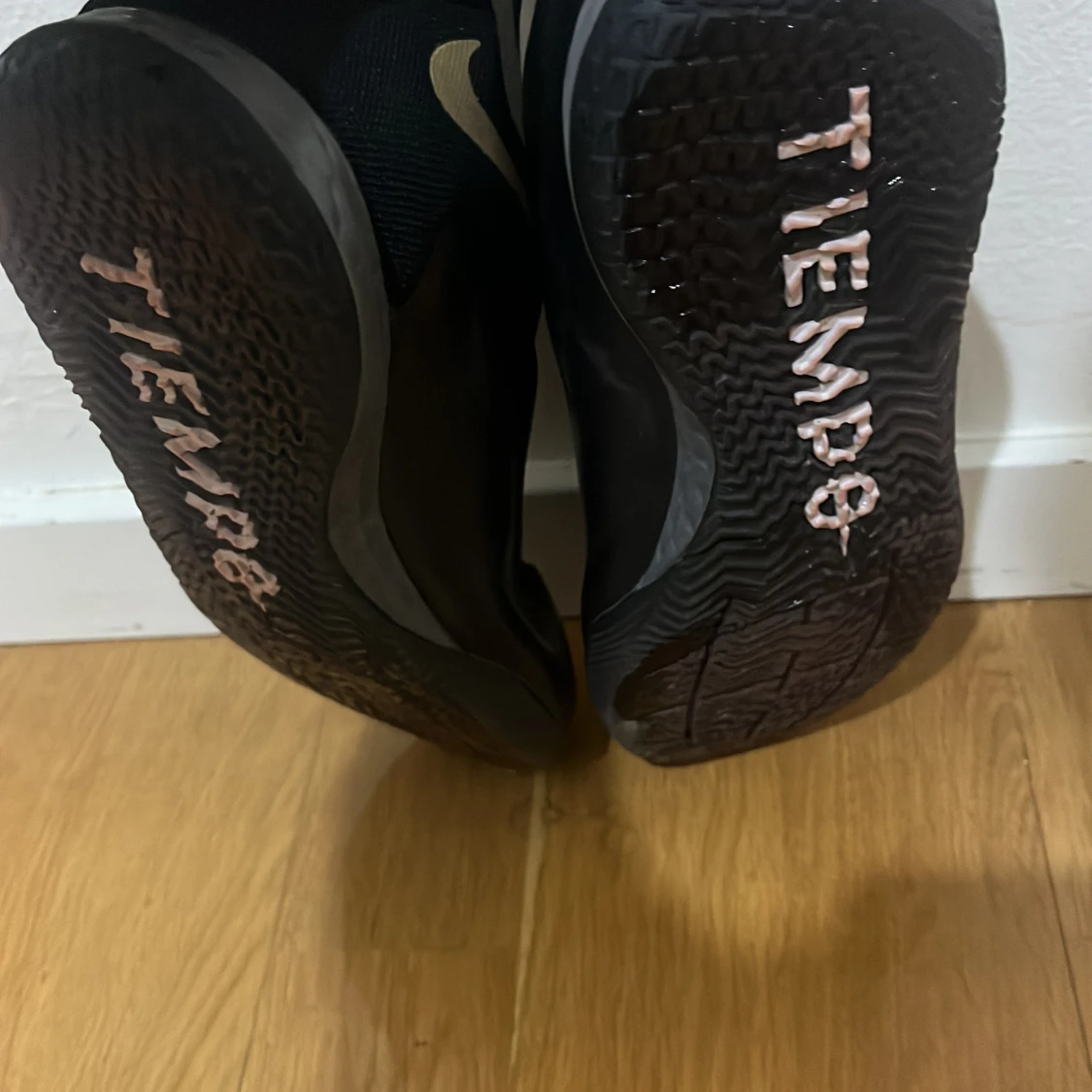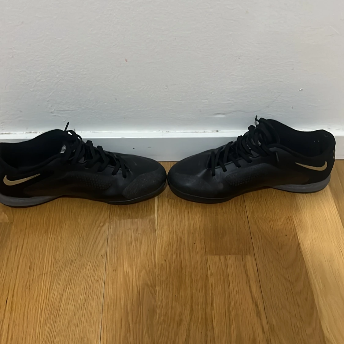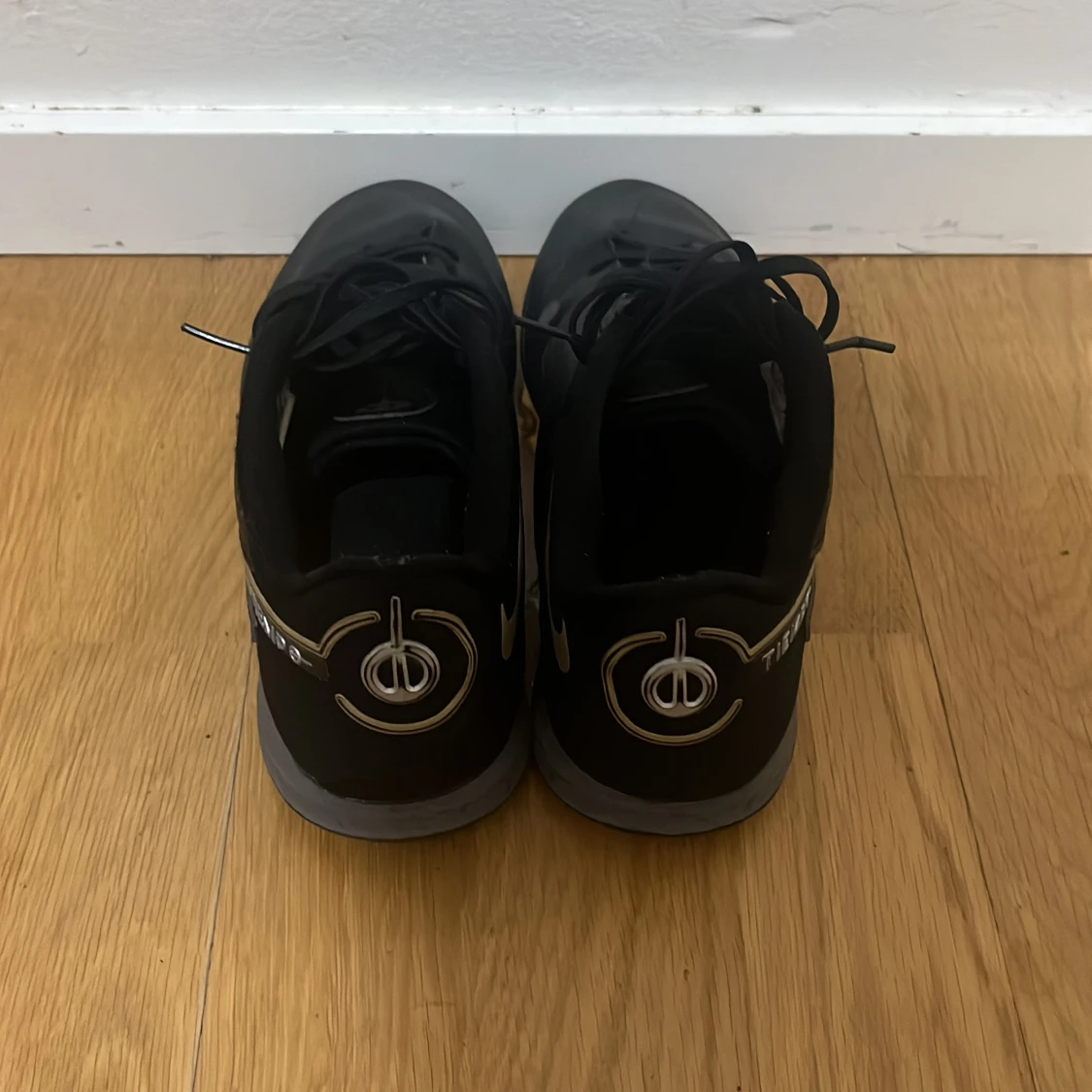 Svarta Nike Tiempo fotbollsskor med guldiga detaljer och klassisk Swoosh på sidan. Skorna har snörning och platt sula med TIEMPO-tryck undertill. Tillverkade i syntetmaterial och designade för inomhusspel. Snygg och sportig look för dig som älskar fotboll.