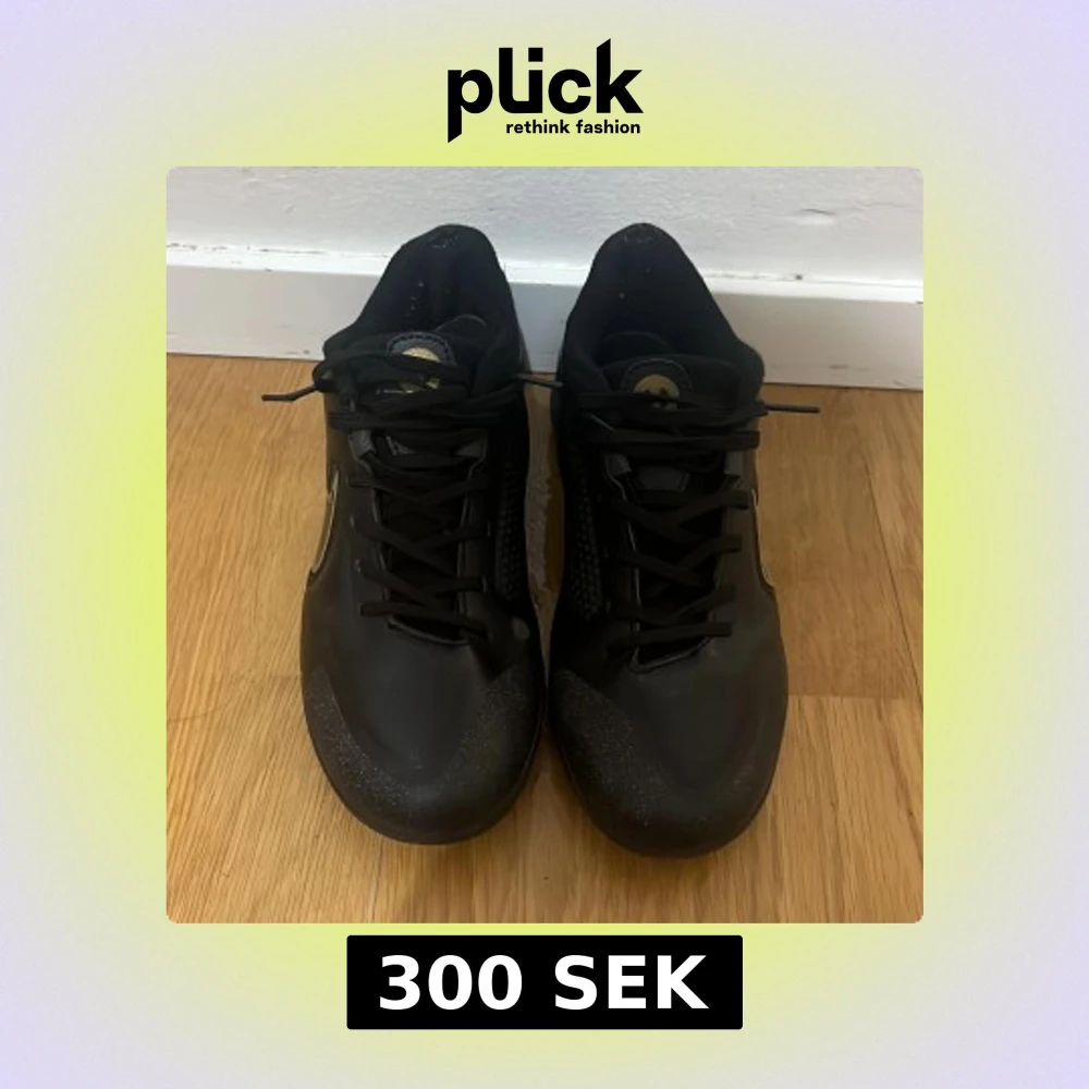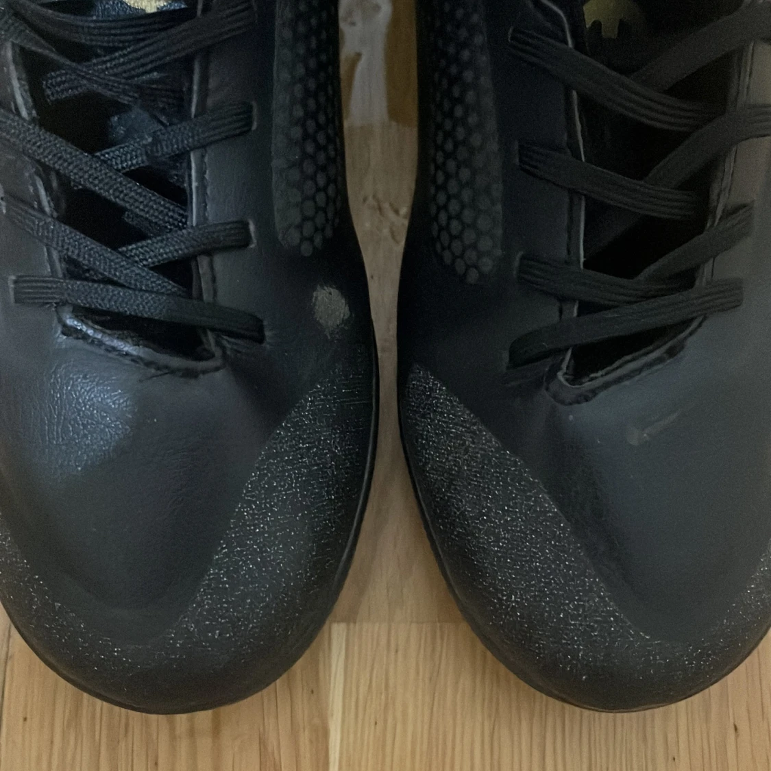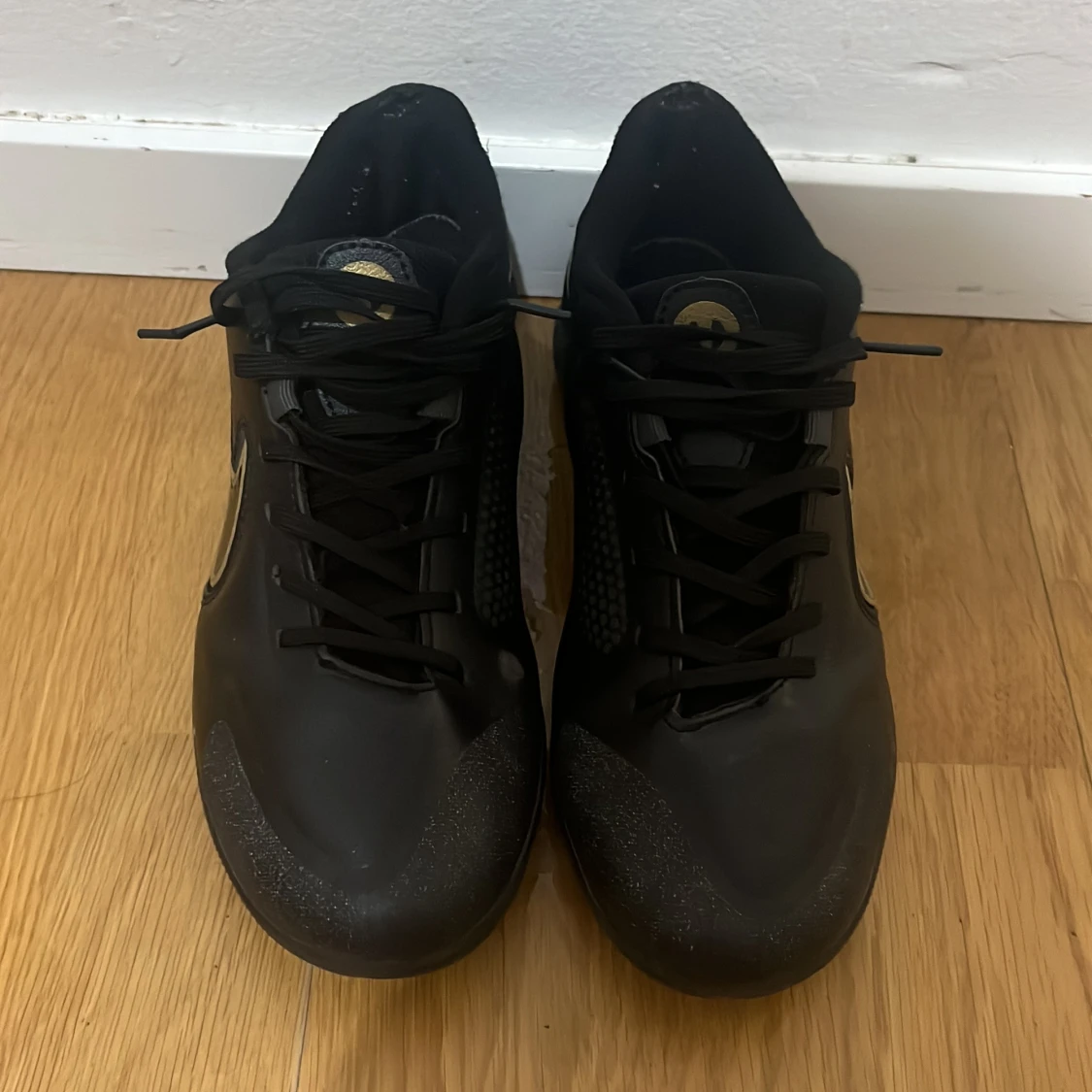 Svarta Nike Tiempo fotbollsskor med guldiga detaljer och klassisk Swoosh på sidan. Skorna har snörning och platt sula med TIEMPO-tryck undertill. Tillverkade i syntetmaterial och designade för inomhusspel. Snygg och sportig look för dig som älskar fotboll.
