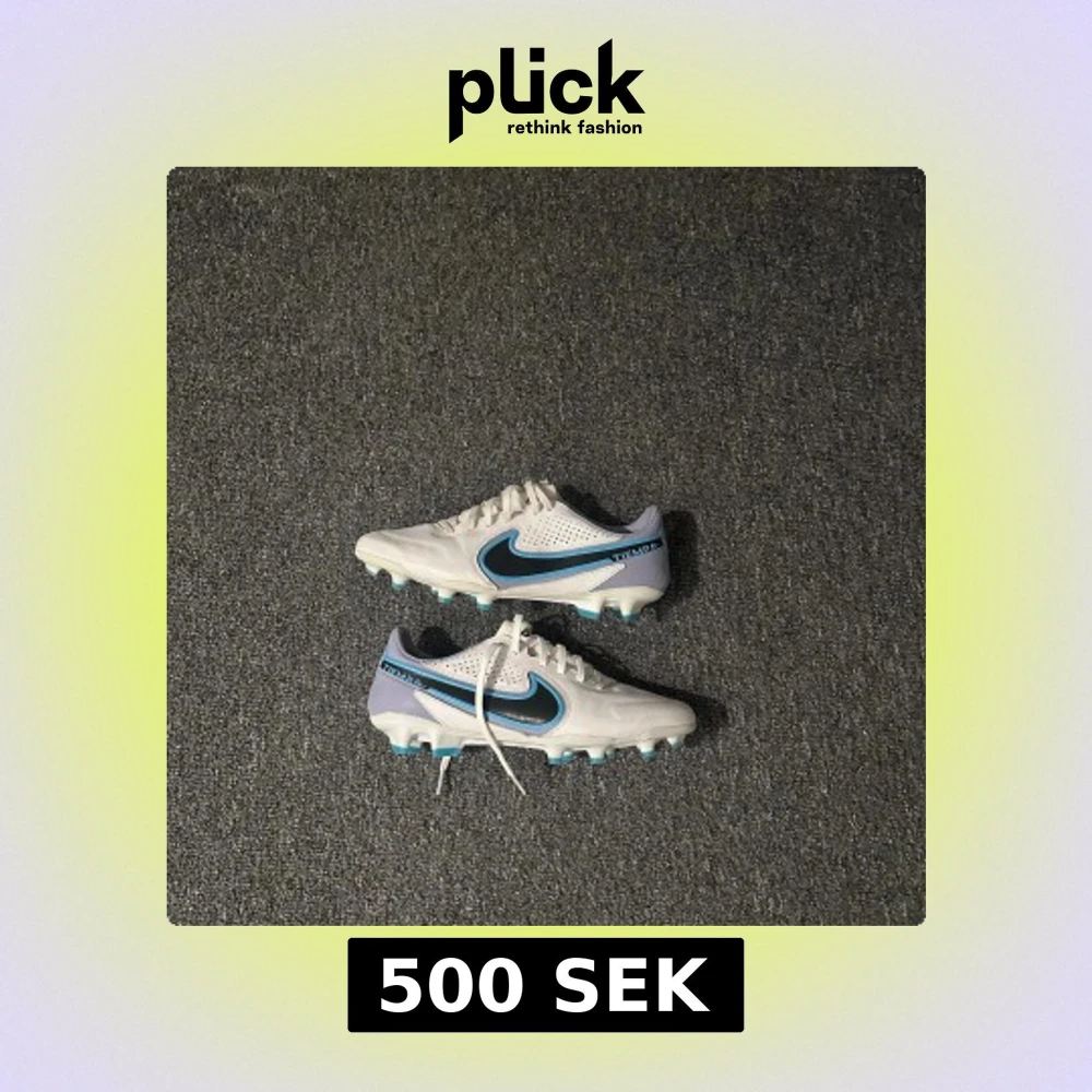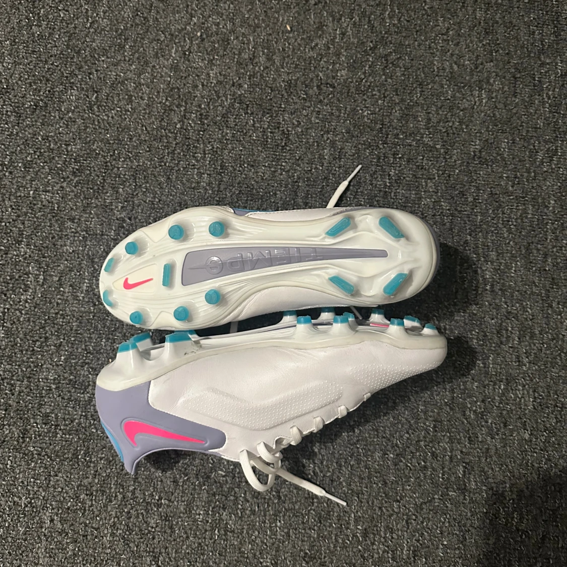 Säljer ett par Nike Tiempo fotbollsskor i vitt med blå och svarta detaljer samt lila och rosa inslag. Skorna har snörning, platt sula med dobbar och är tillverkade i syntetmaterial. Perfekta för dig som vill sticka ut på planen med stilrena och sportiga skor. Helt nya oanvända köpta i unisport för 2000kr