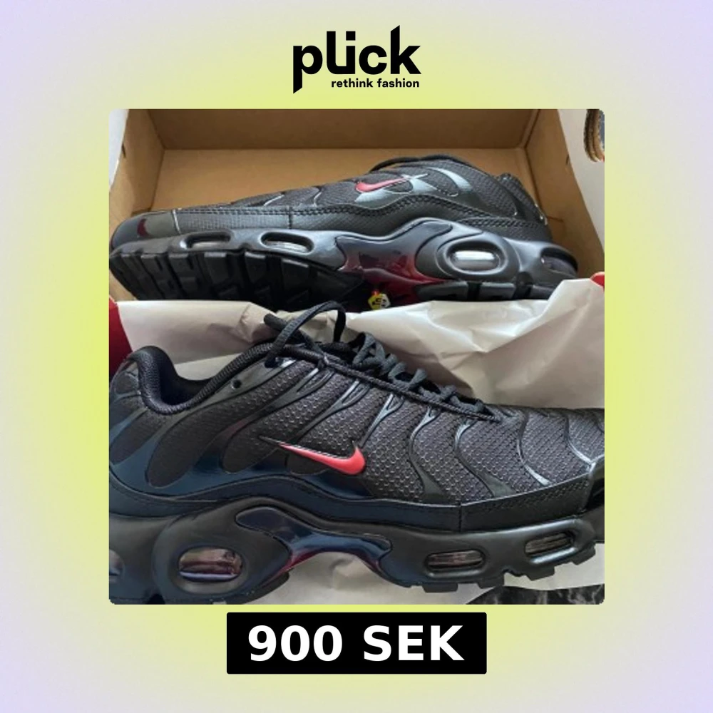 Säljer ett par svarta Nike Air Max Plus TN med röda detaljer. Skorna har en vågig design på ovandelen, svart mesh och syntetmaterial samt en röd Swoosh på sidan. Sulan har synliga luftbubblor och robust mönster undertill. Skriv gärna om mer bilder eller frågor.