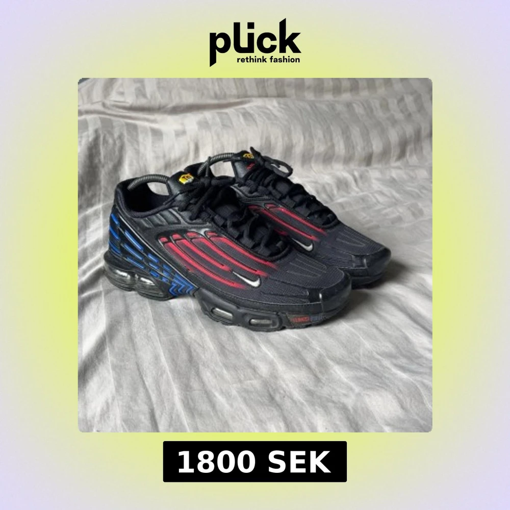 Nike Tuned Air sneakers med svart mesh och syntet, röda och blå detaljer på sidor och sula. Snygg futuristisk design med synlig luftdämpning, silverfärgade swooshes och snörning. Perfekta för dig som gillar streetwear och unika färgkombos.