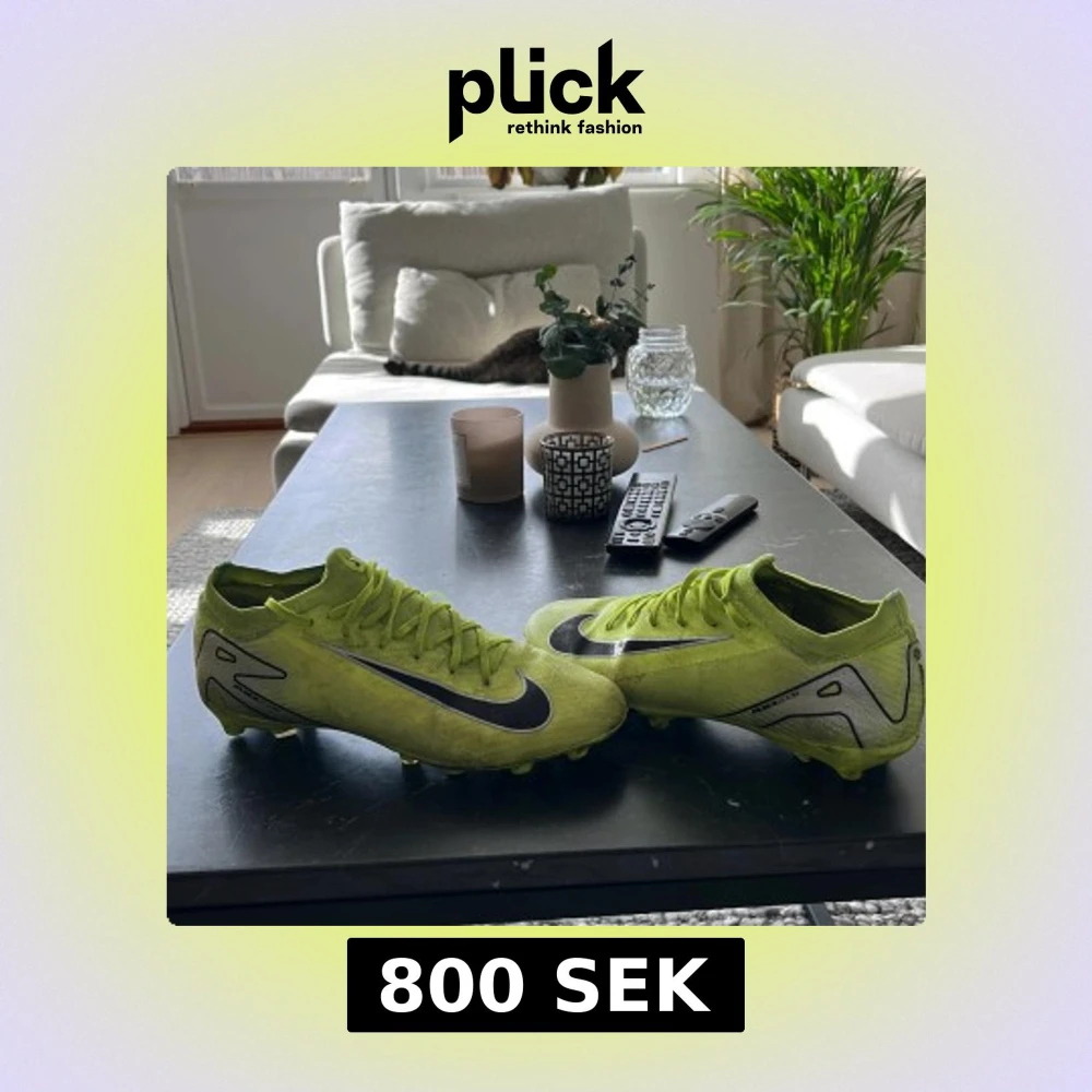 Säljer ett par Nike Mercurial fotbollsskor i en riktigt skarp gul färg med svarta detaljer och Nike-logga. Skorna har snörning, platt sula med dobbar och är tillverkade i syntetmaterial för bästa grepp på planen. Perfekta för dig som vill sticka ut på fotbollen! Lägg bud själv