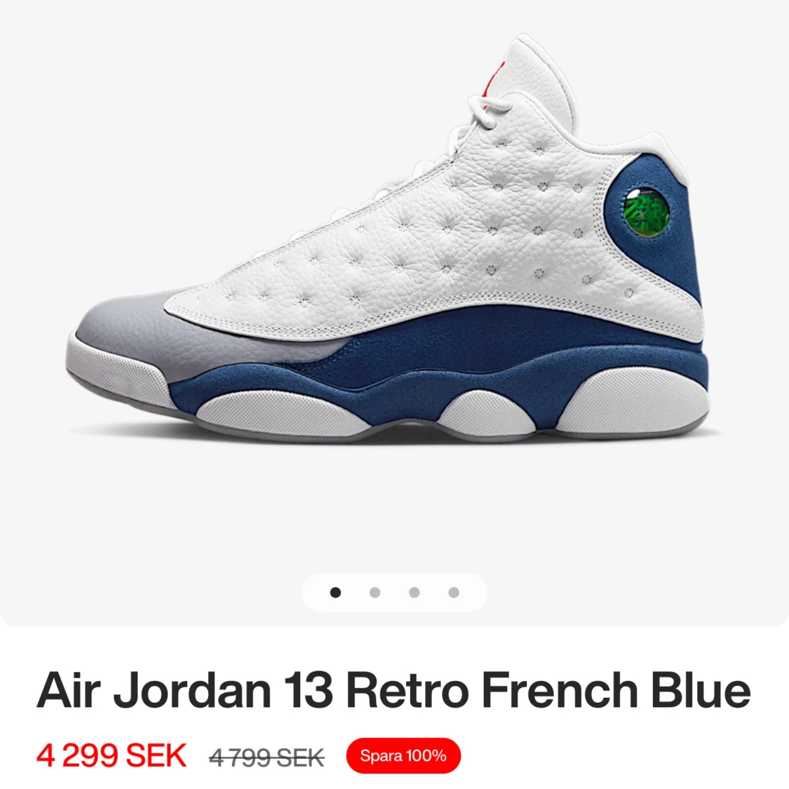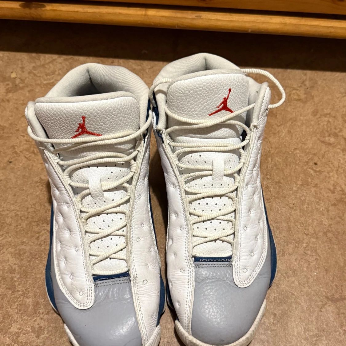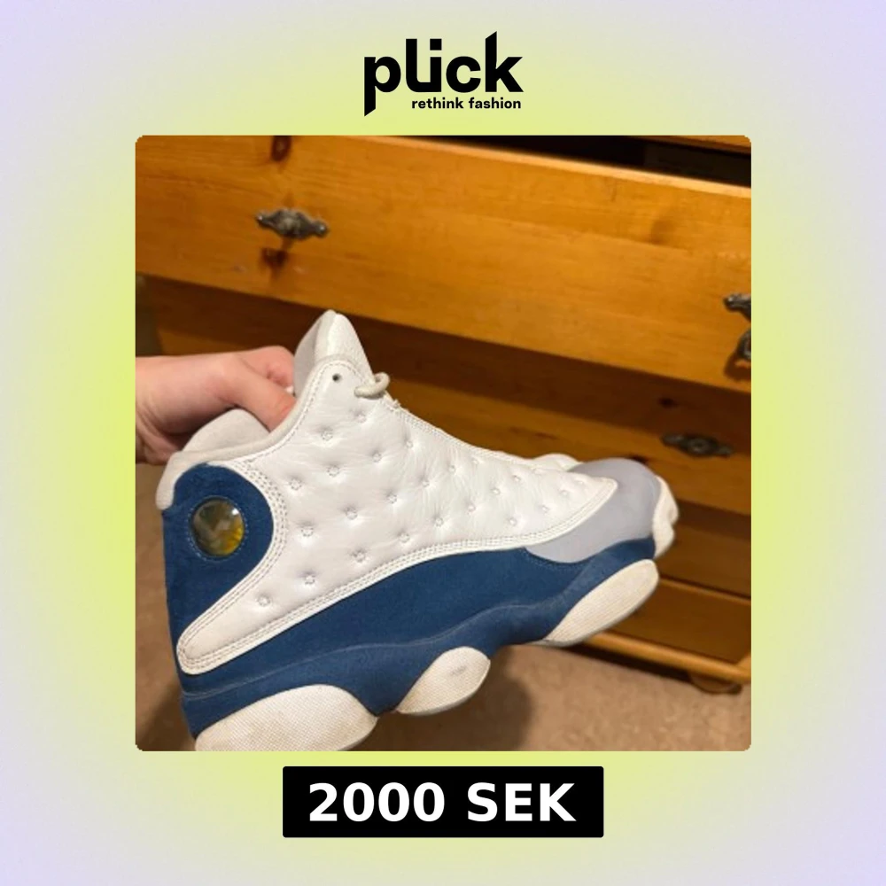 Nike Air Jordan 13 Retro med vit ovandel i skinn, blå mockadetaljer och grå tå. Röd Jumpman-logga på plösen och hologramdetalj vid hälen. Klassisk siluett med snörning och rund tå. Perfekta för dig som vill sticka ut med en ikonisk sneaker. Använda 5-10 gånger. Marketprice 4000-4800 kr