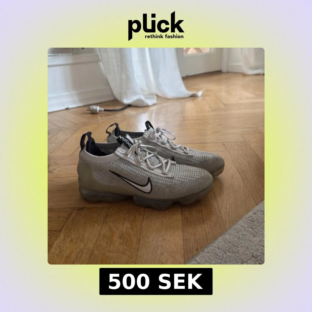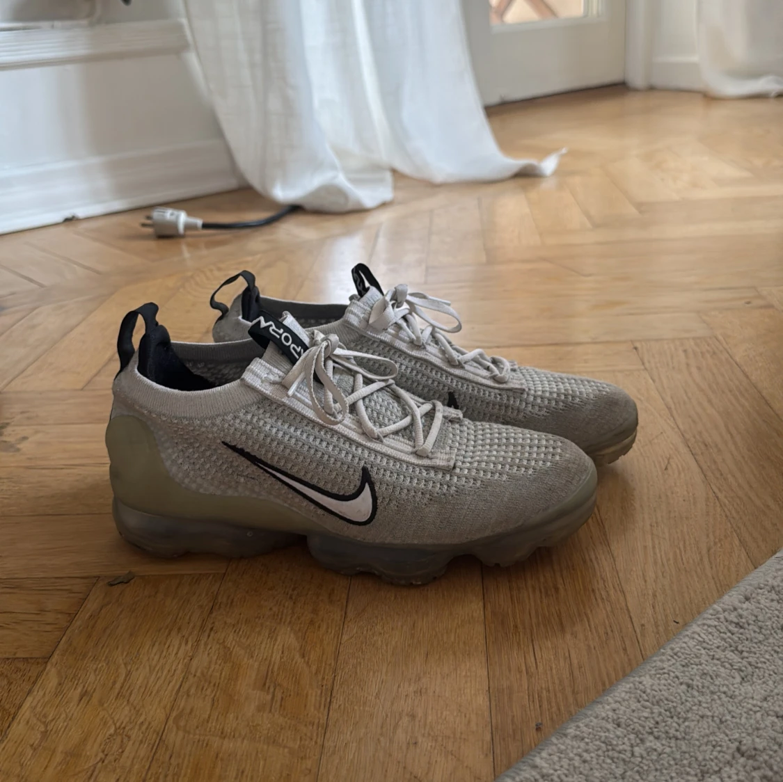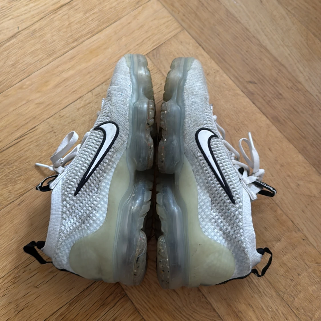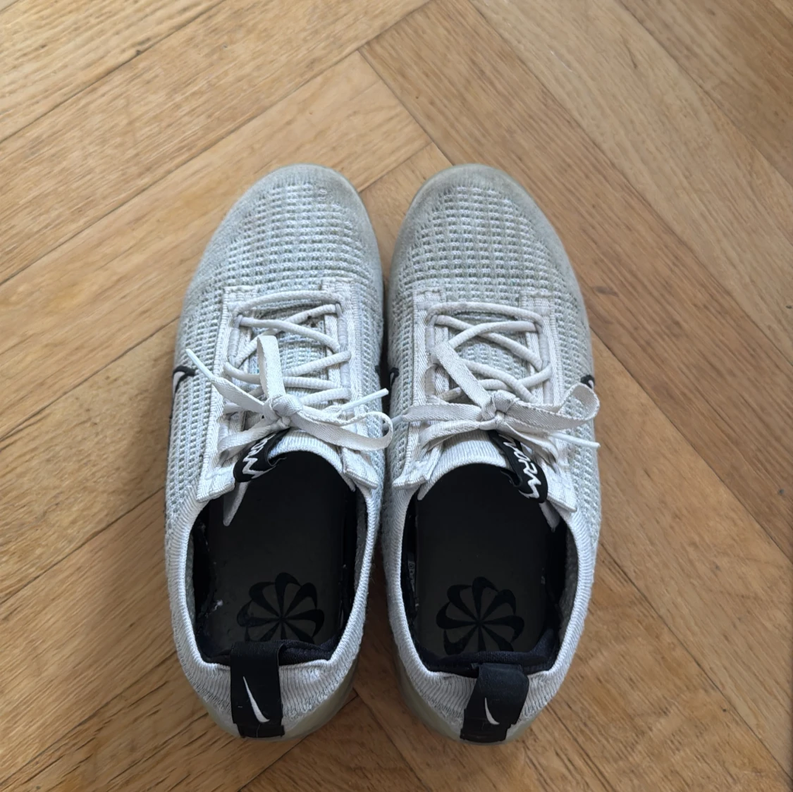 Nike Vapormax Flyknit sneakers i ljusgrått och vitt med svart swoosh. Ovandel i stickad flyknit för en luftig känsla och cool look. Genomskinlig sula med den klassiska Vapormax-dämpningen. Har dock ingen box till skorna.