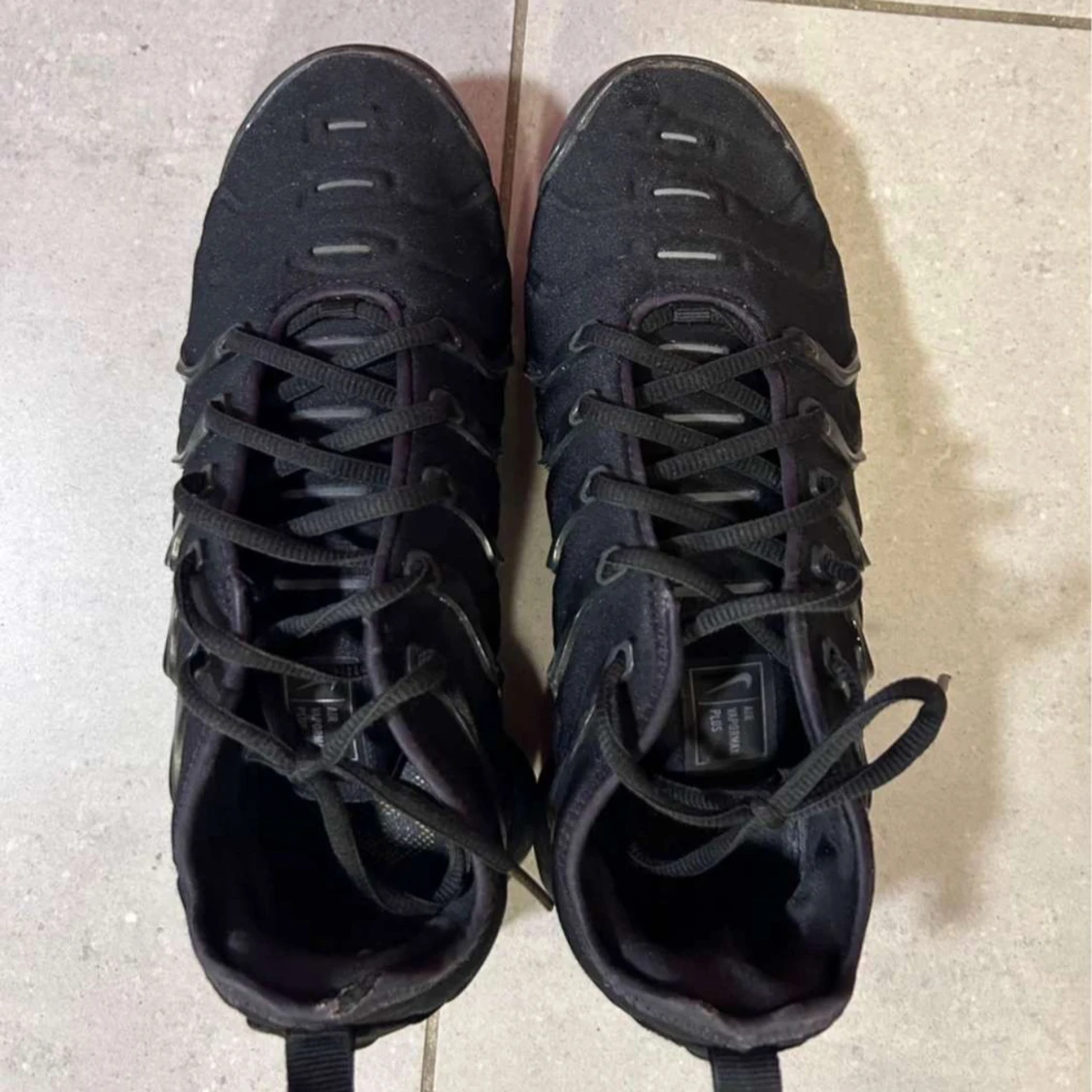 Snygga svarta Nike sneakers med en futuristisk design och synlig dämpning i sulan. Skorna har snörning och en robust look som passar perfekt för en urban stil. Skorna är använda men fungerar ändå. Original pris 2500kr. Pris kan diskuteras!