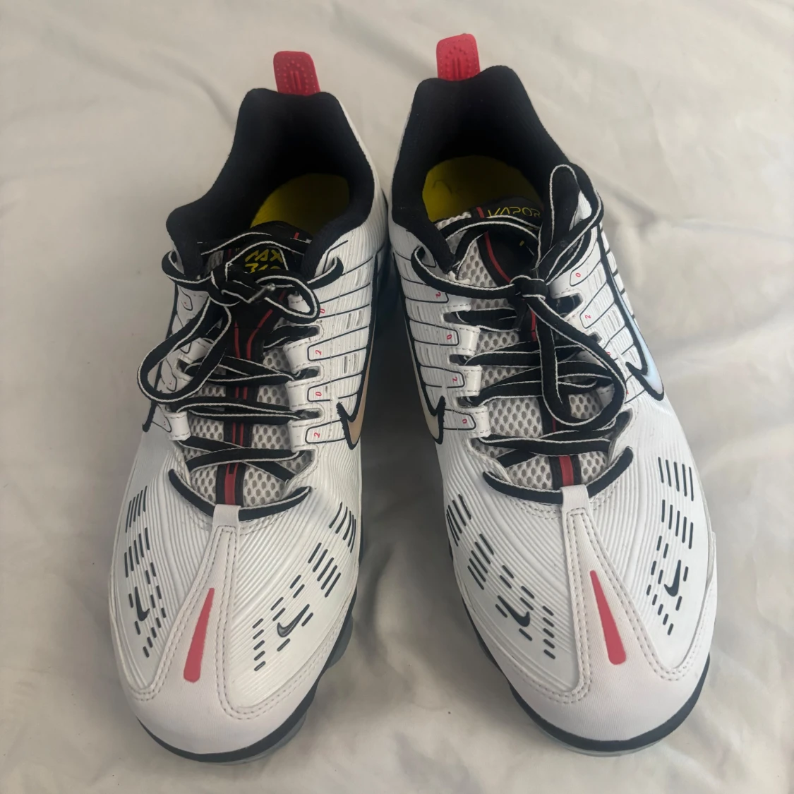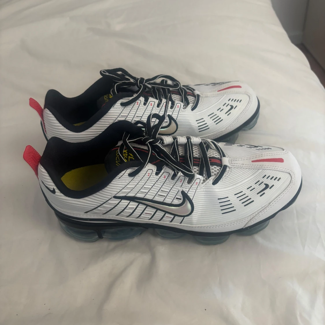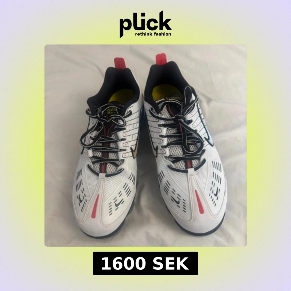 Nike Vapormax sneakers i vitt med svarta och röda detaljer. Snygg futuristisk design med synlig bubbelsula, svarta snören och meshpaneler för extra ventilation. Silverfärgad swoosh på sidan och röd dragflik bak. Perfekta för dig som gillar streetstyle och sportig look. HELT NYA