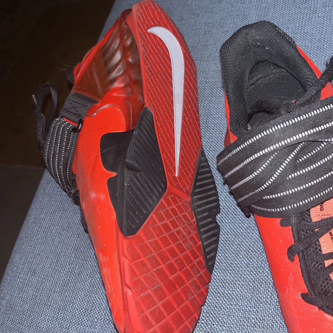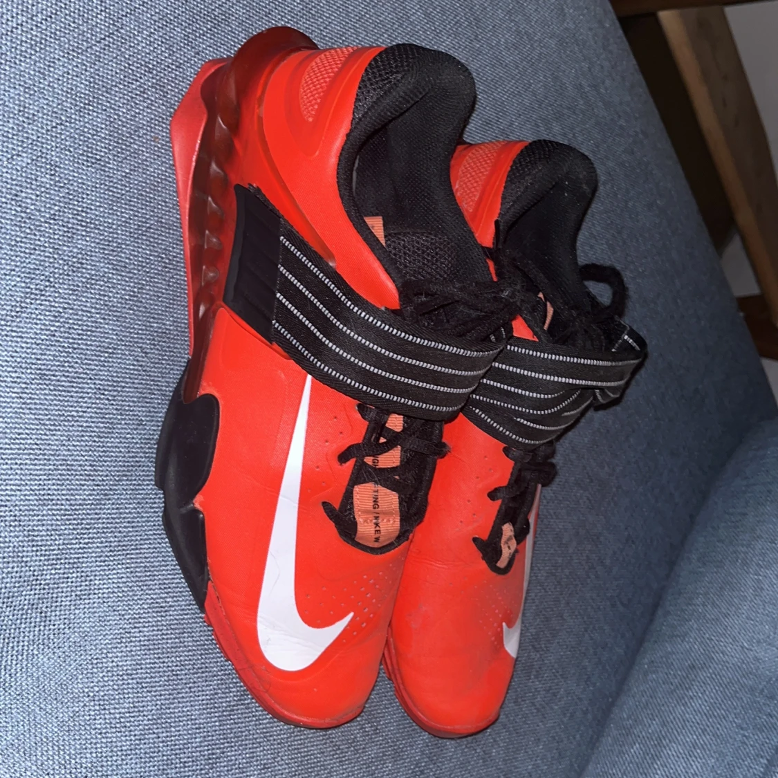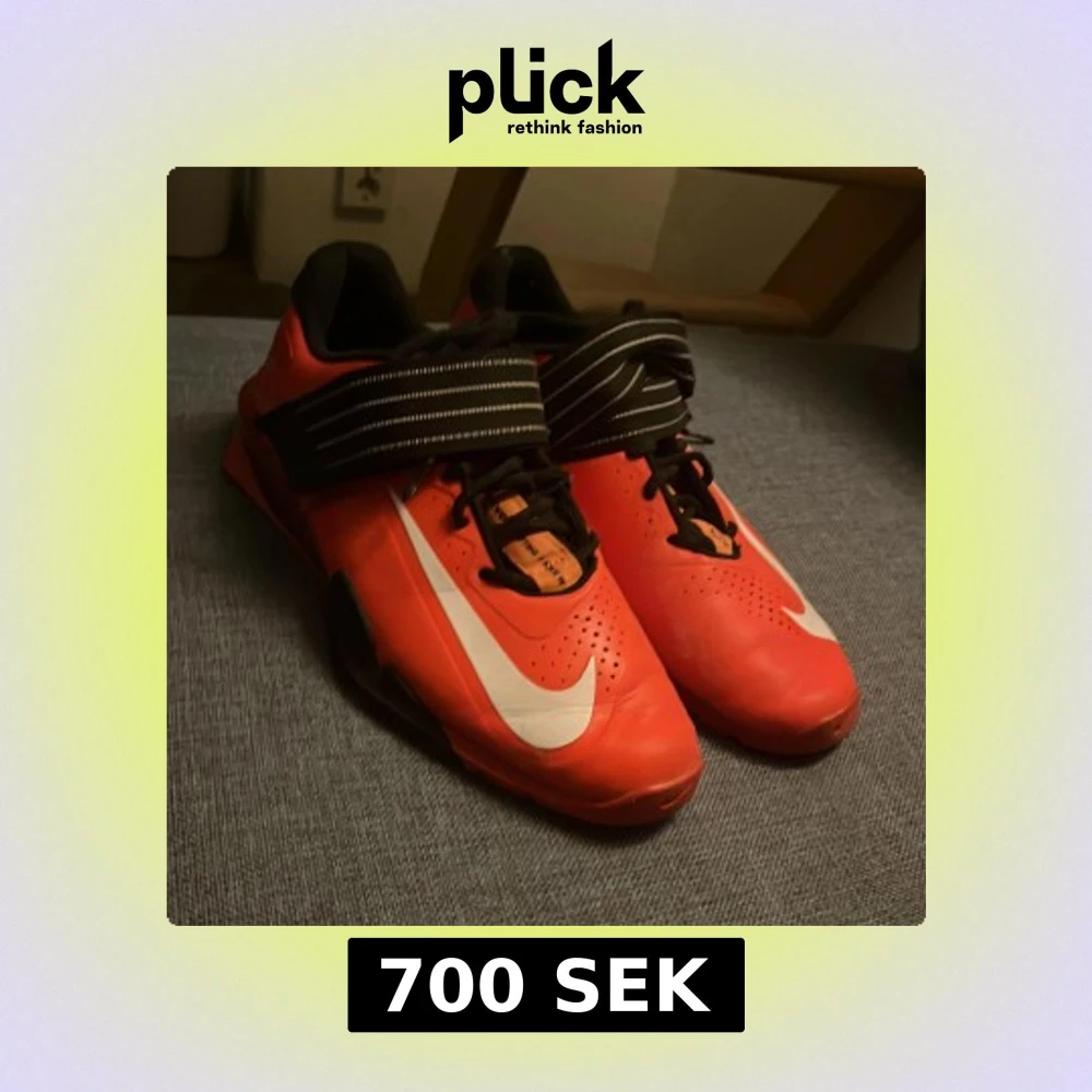 Snygga röda Nike träningsskor med svart och vit detaljering. Skorna har snörning och ett brett band över foten för extra stöd. Perfekta för gymmet eller annan träning.