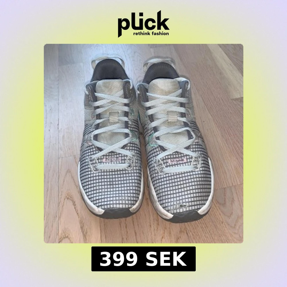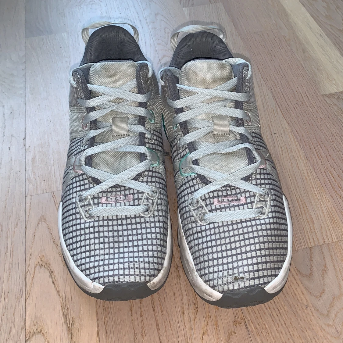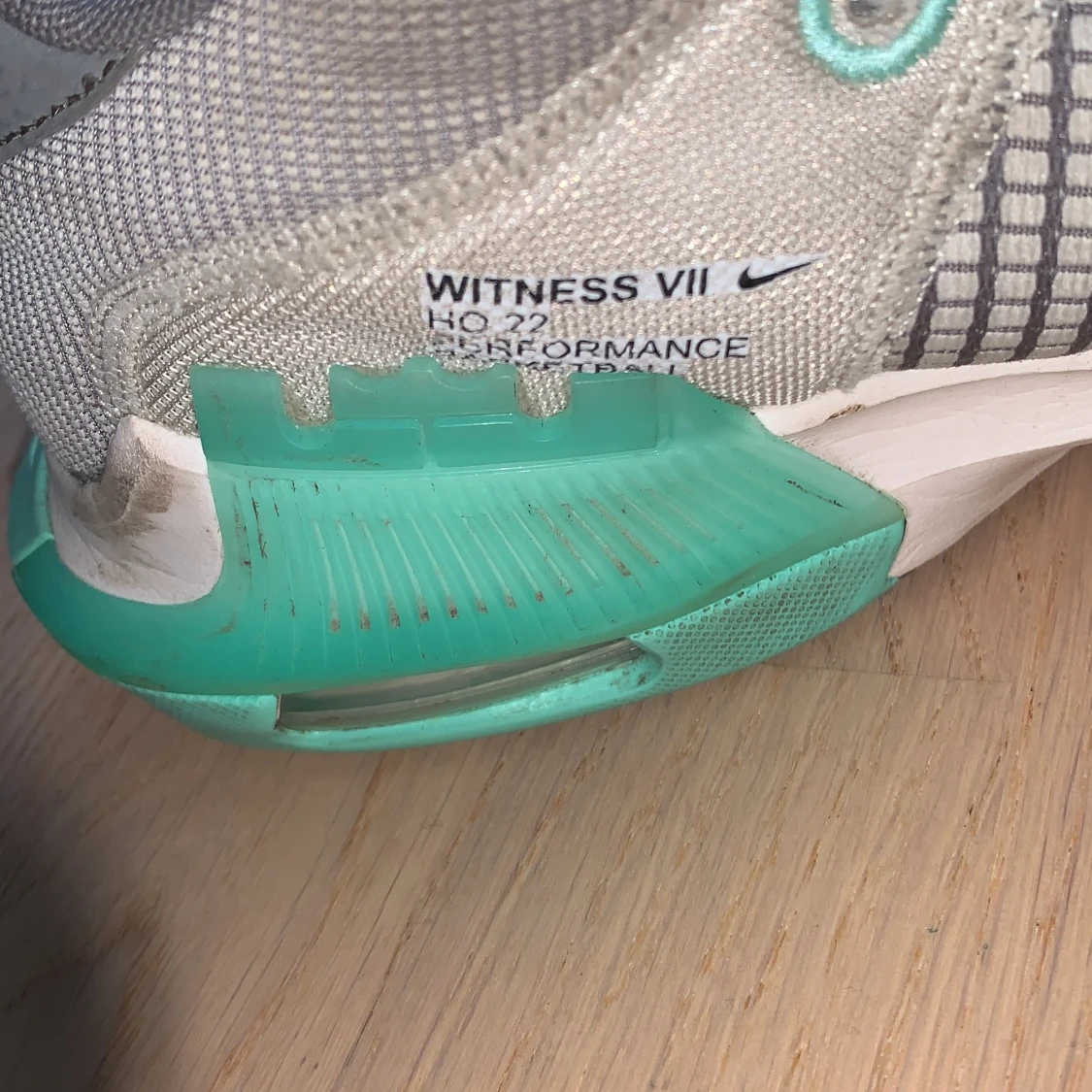 Snygga Nike Witness VII sneakers med ett rutigt mönster i grått och vitt. Skorna har en unik design med turkosa detaljer och snörning. Perfekta för träning eller vardagsbruk.