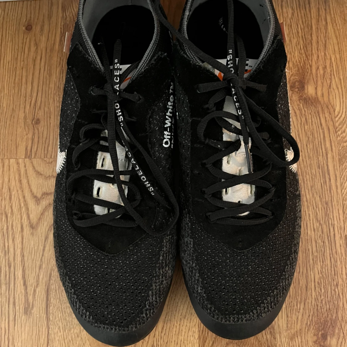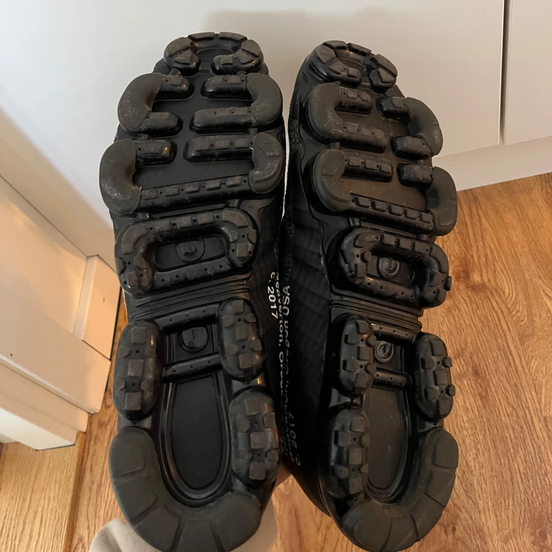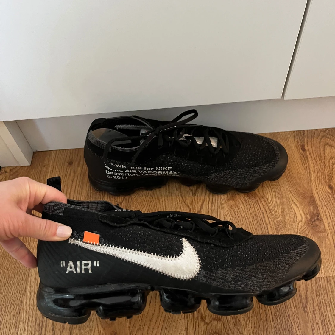 Svarta sneakers Nike x Off-white Air Vapormax i storlek 45. Skorna är i mycket fint skick. Den röda taggen medföljer tyvärr ej och inte heller originalkartongen. Sula i 100% gummi och resten 100% polyester.