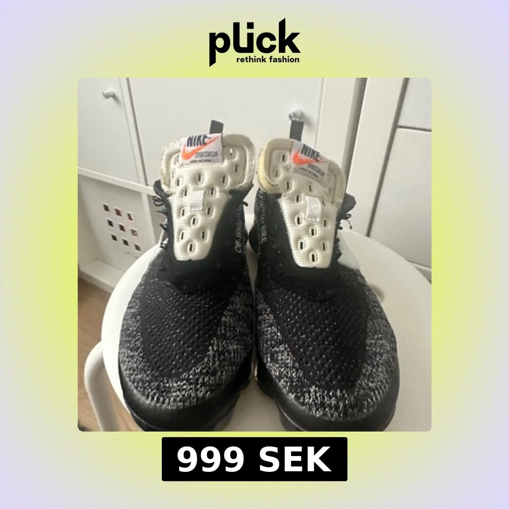 Svarta och vita Nike x Off-White Vapormax sneakers med stickad ovandel, tydliga Off-White detaljer och text på sidan. Skorna har en unik design med vit plös, svarta snören och synlig sula. Perfekta för dig som gillar streetwear och vill sticka ut.