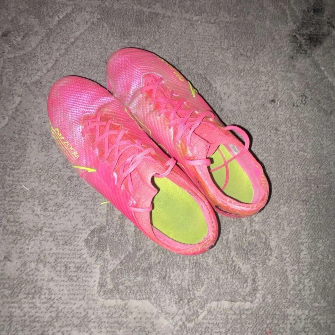 Säljer ett par Nike Zoom fotbollsskor i en riktigt snygg rosa färg med gula detaljer och sula. Skorna har snörning och är tillverkade i syntetmaterial för lätt känsla på planen. Perfekta för dig som vill sticka ut på matchen!