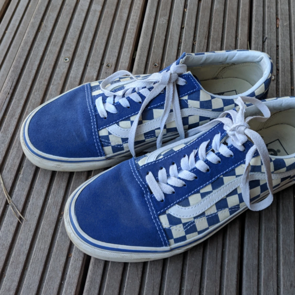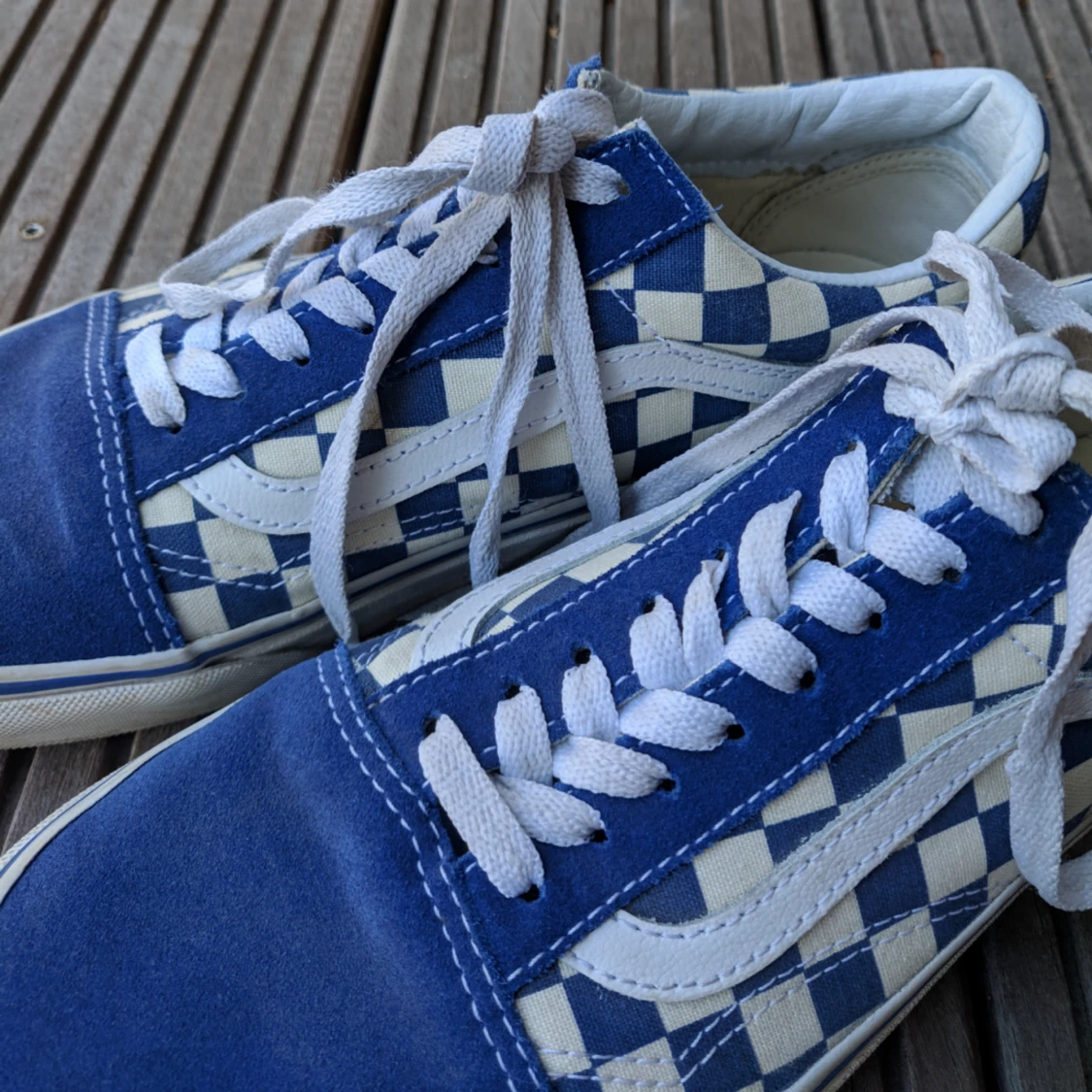 Lätt använda rutiga old skools inköpta på zalando 2017. Det enda smutsiga är på rämmen runt sulan och den går lätt att tvätta så blir de som nya :)