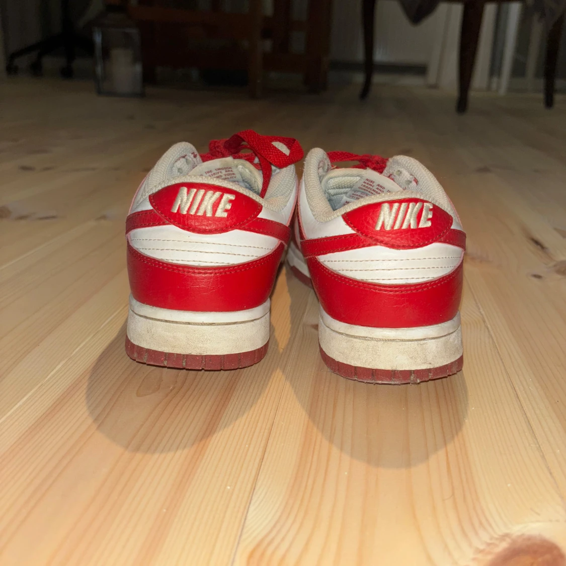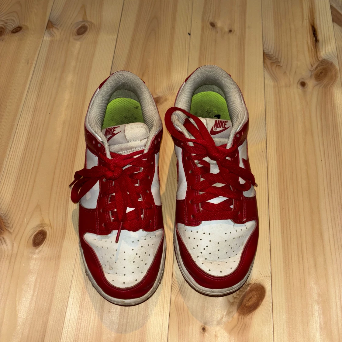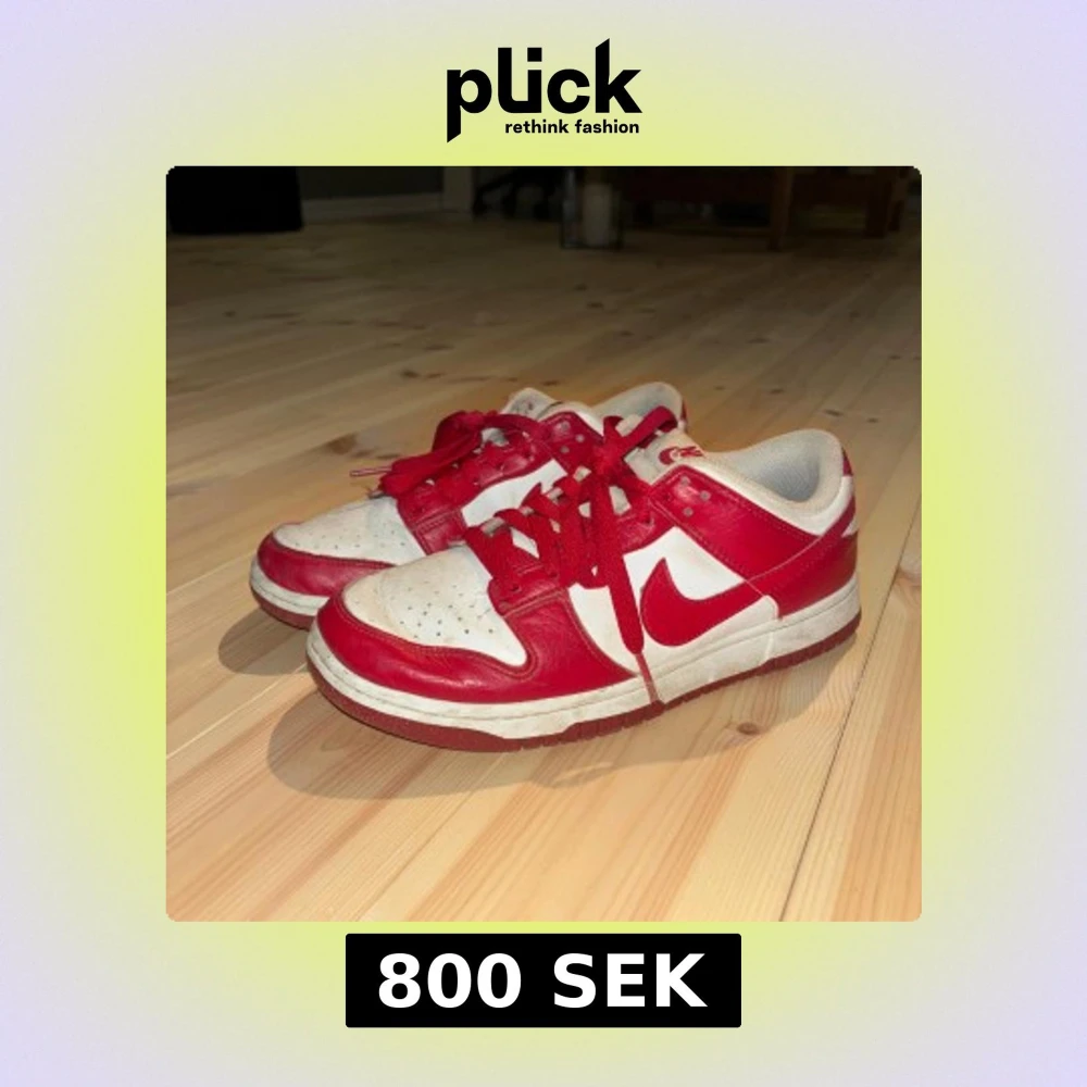 Supercoola röda Nike dunks. Jag köpte till creaseskydd som kommer med i skorna, som skyddar dem från att creasas. Dessa går att ta ut! Skorna är väl använda men tack vare skyddet är de fortfarande i relativt bra skick! Nypris 1500kr